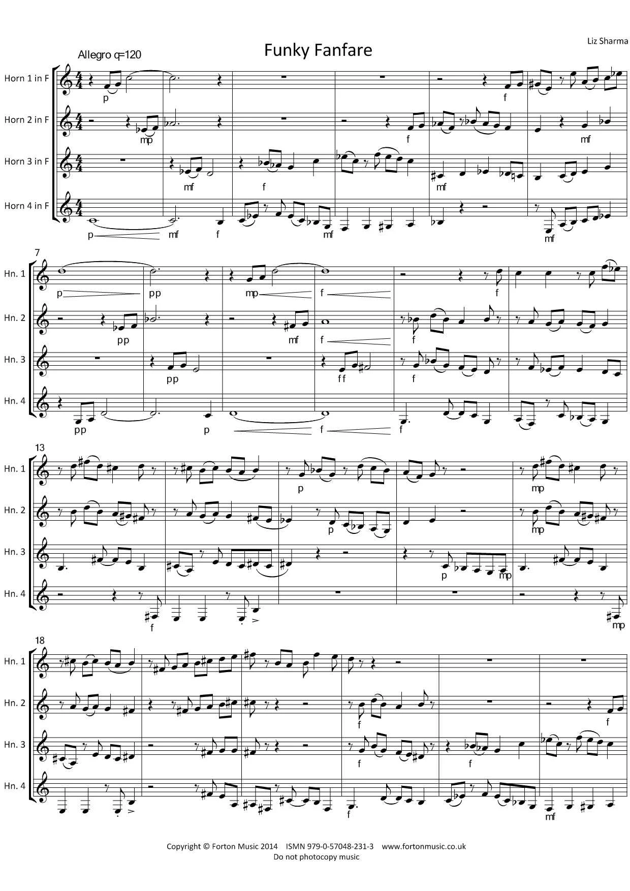 Four pieces for four horns in F. Stylish and idiomatically written for the instruments. Passing through some fairly remote keys and with some zippy rhythms, confident players will have fun with these.