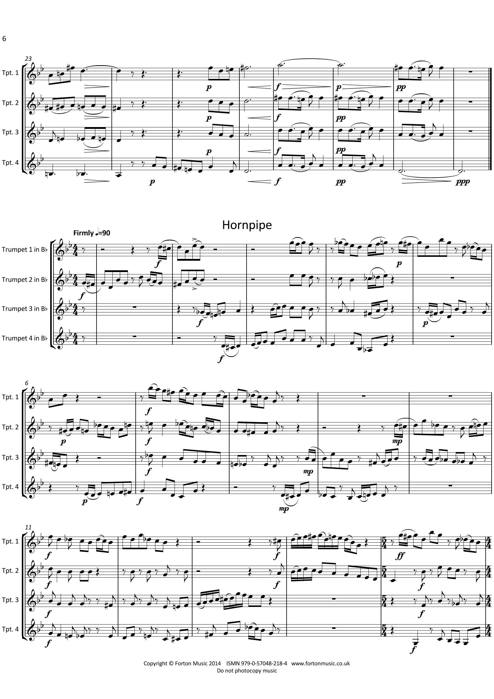 Four pieces for four trumpets in Bb. Stylish and idiomatically written for the instruments. Passing through some fairly remote keys and with some zippy rhythms, confident players will have fun with these.