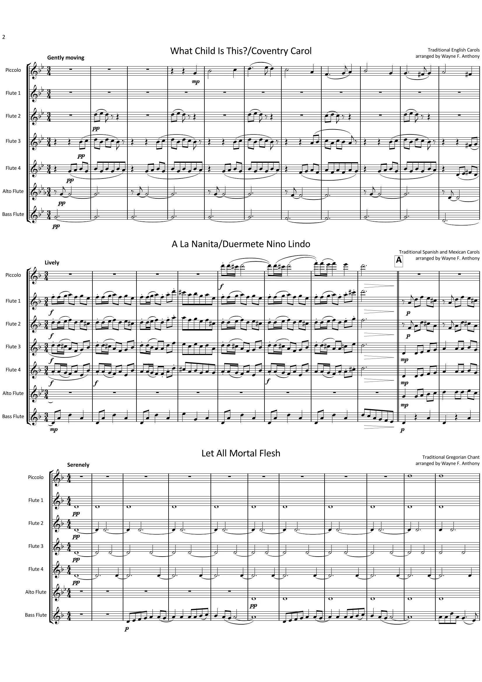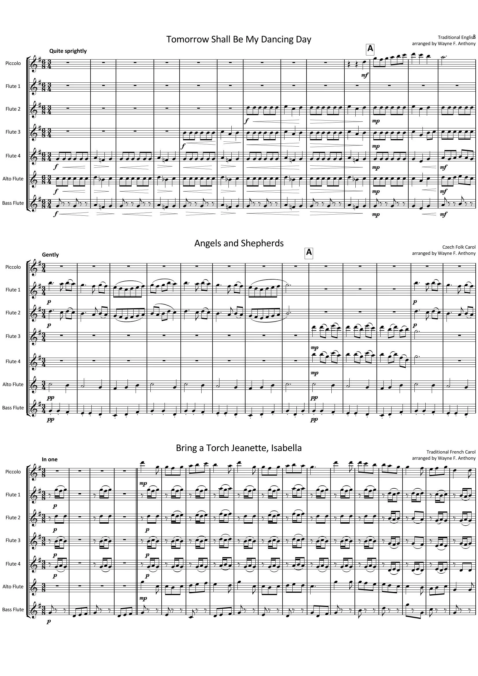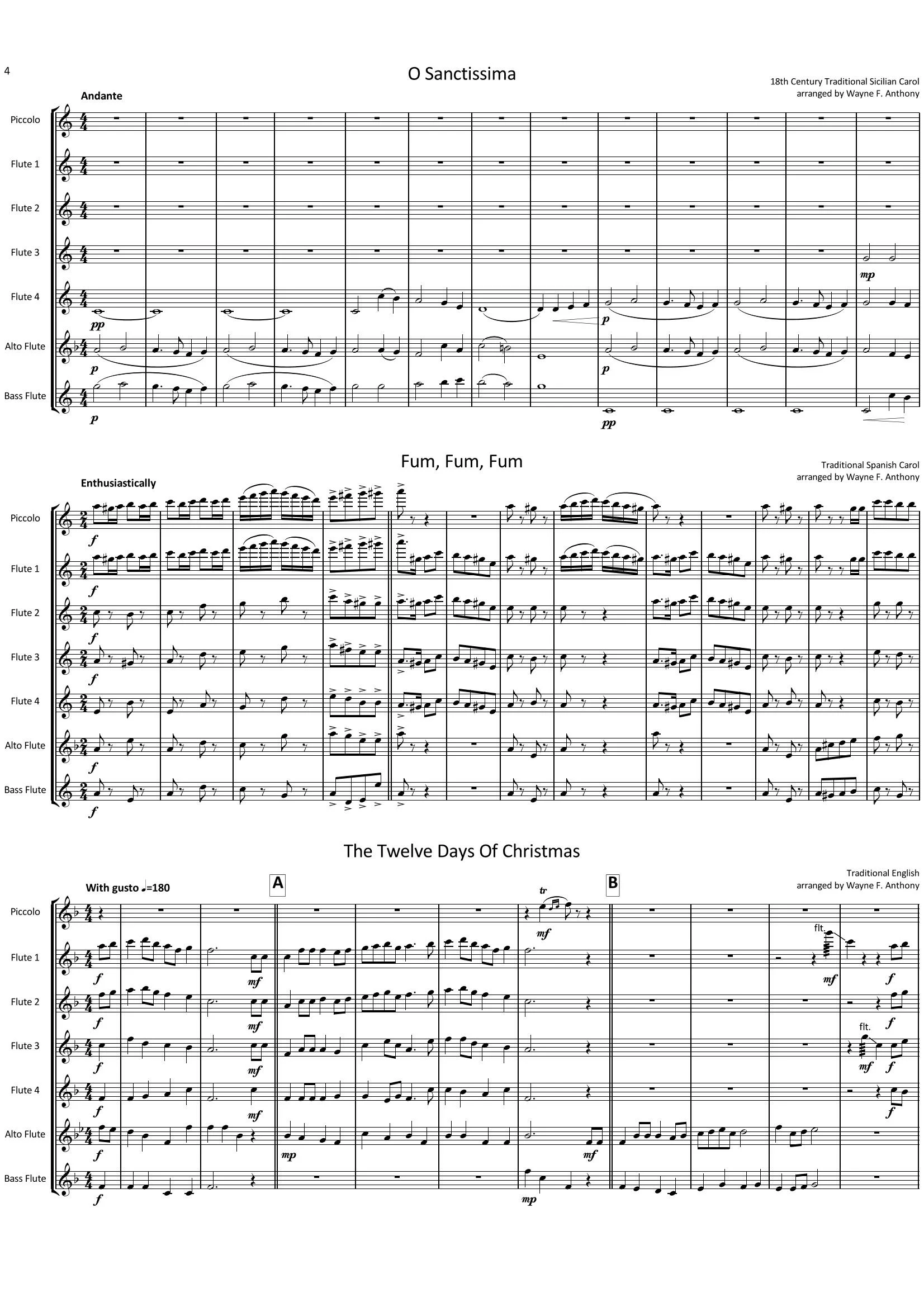 A December Dozen (The Flute Choir Holiday Gig Book) is a series of arrangements utilizing December holiday tunes from around the globe. They are set for a small flute choir (picc., 4 C flutes, Alto flute, bass flute), and the parts may be doubled for larger ensembles without affecting overall balance and sound quality. The level of the arrangements runs from easily sight-readable to moderately difficult. Each classic melody is handled in a unique fashion, spotlighting technical aspects natural to the instruments and fitting to the tune’s historical origins. The book offers a perfect solution to any group’s repertoire needs for busiest annual performance season when ensembles are in highest demand.