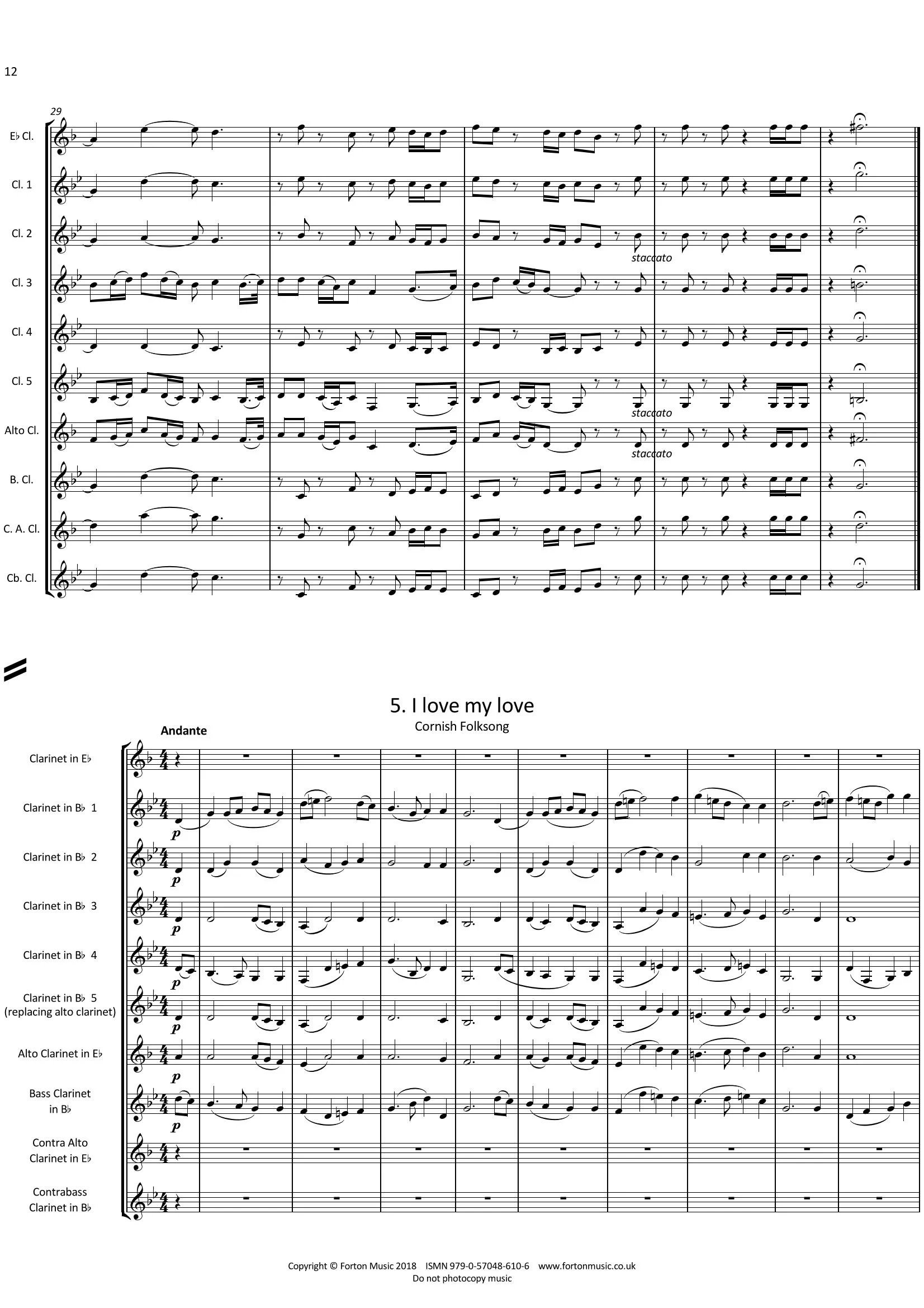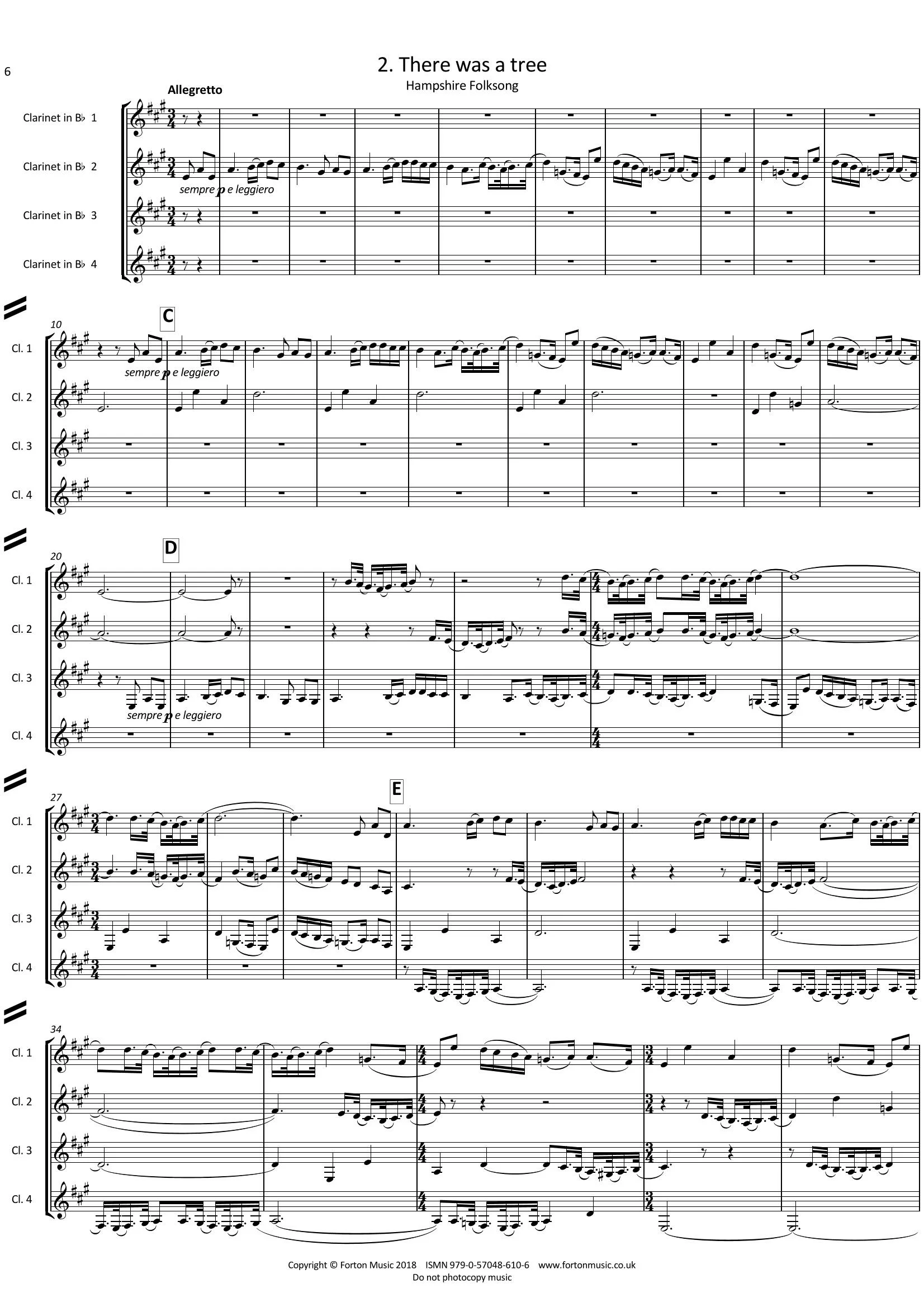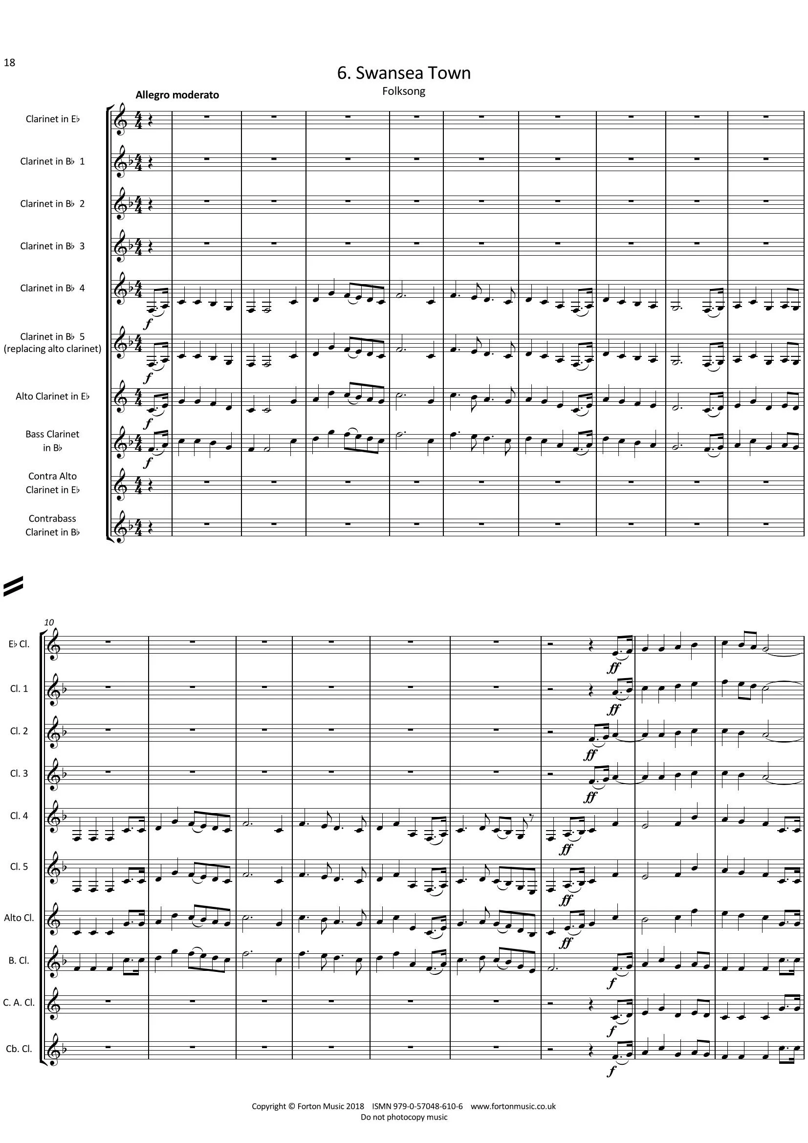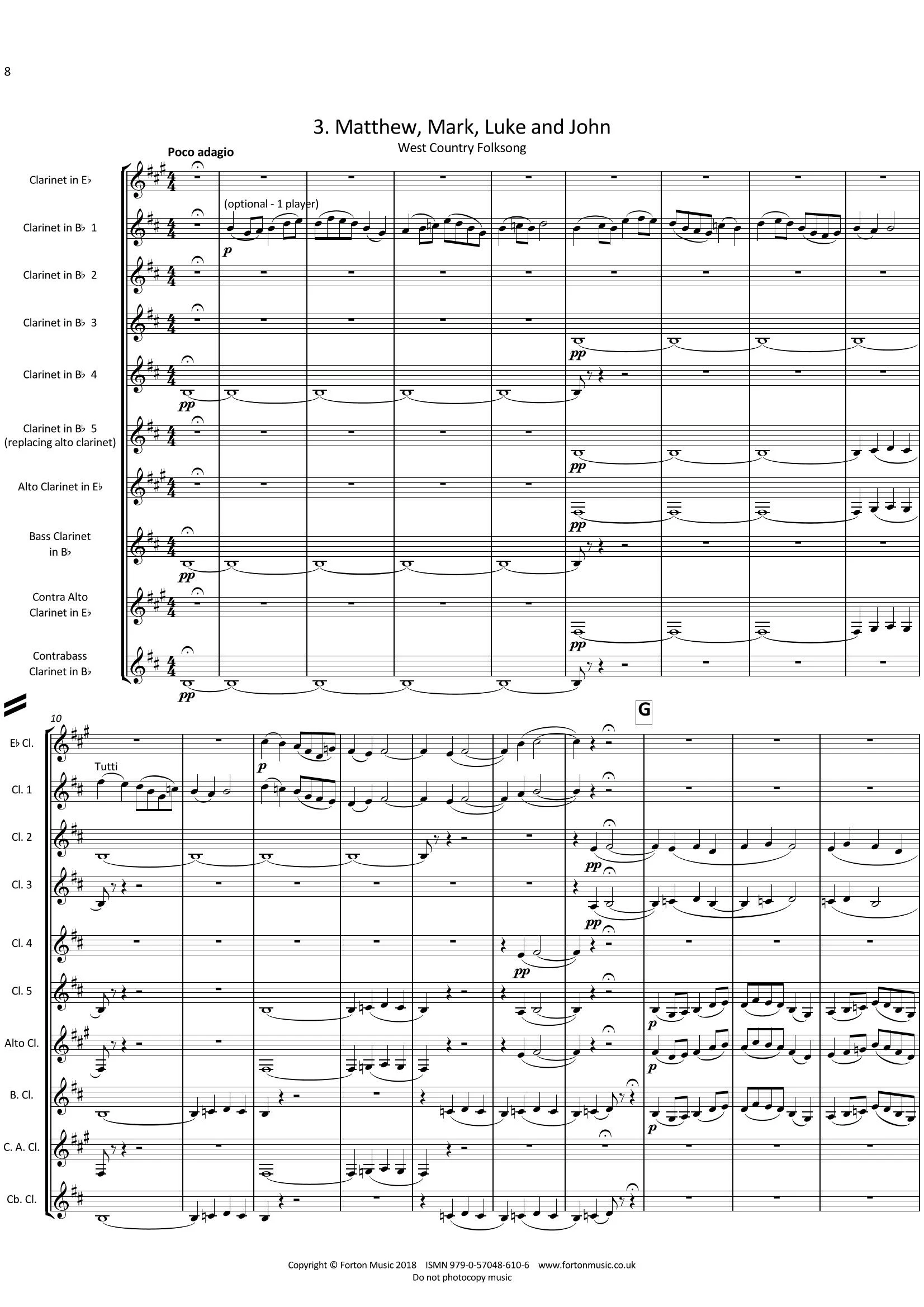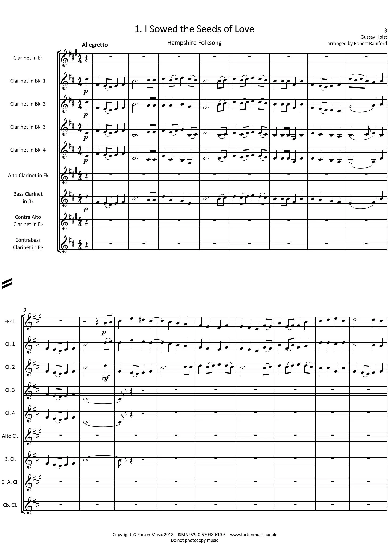 This Suite has been arranged from Holst’s 6 Choral Folksongs, Op. 36.Holst never collected folksongs in the way that Cecil Sharp or William Gillies Whittaker did, but through his friendship with these collectors and other composers such as Ralph Vaughan Williams he became aware of their work. Here, he sets six folksongs in his own inimitable style. ‘I Sowed the Seeds of Love’ is a fairly gentle introduction to this set, with first of all a unison tune and then a high trio of players. This expands through the next verse until all the players have joined into a triumphant acclamation, before fading away to a quiet ending. ‘There was a tree’ is scored extremely lightly, for just the four clarinet parts. Each voice takes the theme in turn, and then continues contrapuntally until all four voices are weaving round each other in the manner of a Renaissance motet. With minimal dynamics, this creates and almost scurrying effect. ‘Matthew, Mark, Luke and John’ takes a simple, child’s bedtime prayer and turns it into a sinister march. The first verse is high instruments accompanied by a simple drone; in the second verse the low instruments take the tune under flowing lines above. A loud climax near the end breaks the mood, but not enough and the music sinks back away to nothing. ‘Song of the Blacksmith’ sets up a rhythmic, percussive ostinato through which a more sustained melodic line weaves. Each of the three verses increases in drive and dynamics until a very loud ending. ‘I love my love’ tells the story of a pair of lovers separated by the young man’s parents – he is sent away to sea and she is imprisoned in a madhouse. Finally hearing of her incarceration, the young man rushes back to claim his love and free her from imprisonment. They are married and live happily ever after. ‘Swansea Town’ is a rollicking sea shanty sung by a sailor to his love as the time has come for him to set sail again. Each verse is given a different treatment – in the middle of the setting we can hear a storm at sea with ominous swells in the bass line. This arrangement has been made with maximum flexibility in mind. The contr’alto and contrabass parts are generally optional, and the E flat part avoids the extreme high register. The second movement has been set for clarinets alone, so could be taken by a solo quartet of players. Each movement stands alone, so may be played as separate pieces, or put together in any combination as needed. The simple, generally strophic verse setting makes it relatively easy to put this piece together, leaving more time to work on expression through the tempi and the dynamics.