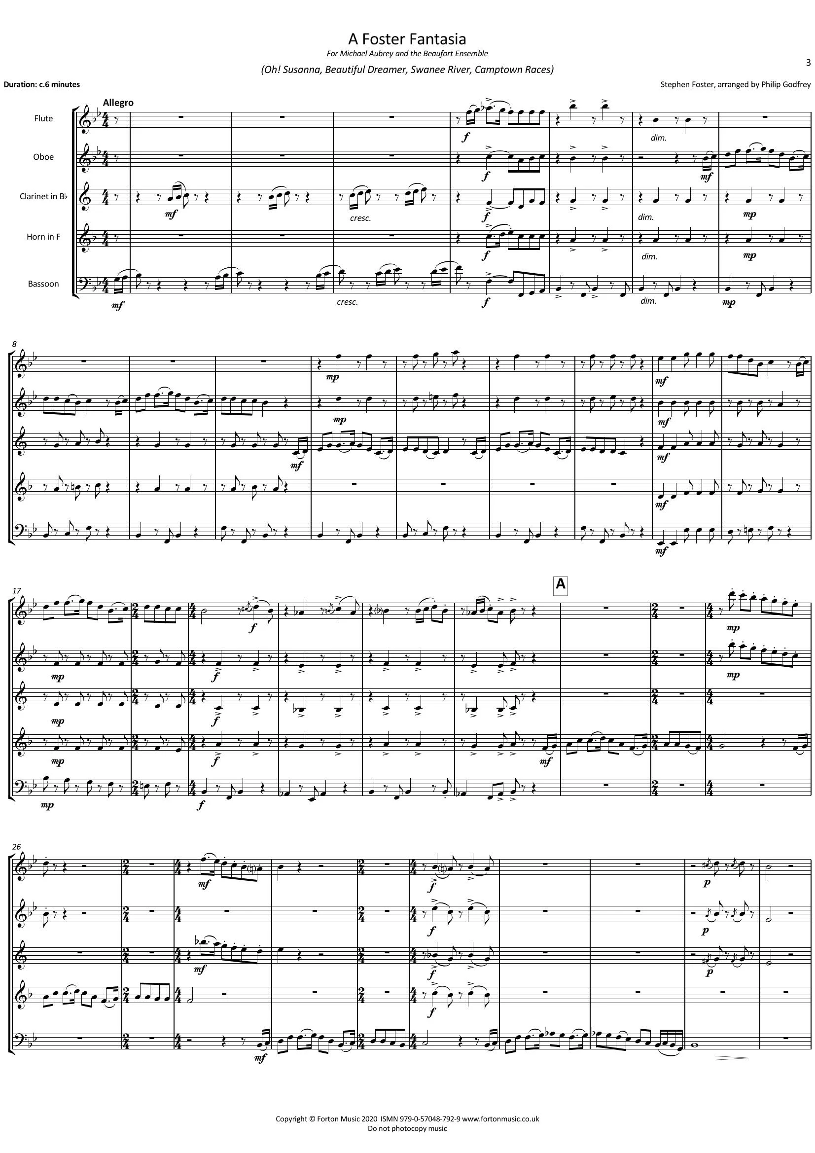 I have long been an admirer of the American composer Stephen Foster (1826-64), who wrote so many wonderful songs. So when I was asked by Michael Aubrey to write a piece for his Beaufort Ensemble I decided to create a medley of some of Foster’s best-known songs. I have been fairly faithful to the original compositions in my arrangement, but in the last one (‘Camptown Races’) I allowed myself a little flight of fantasy!
