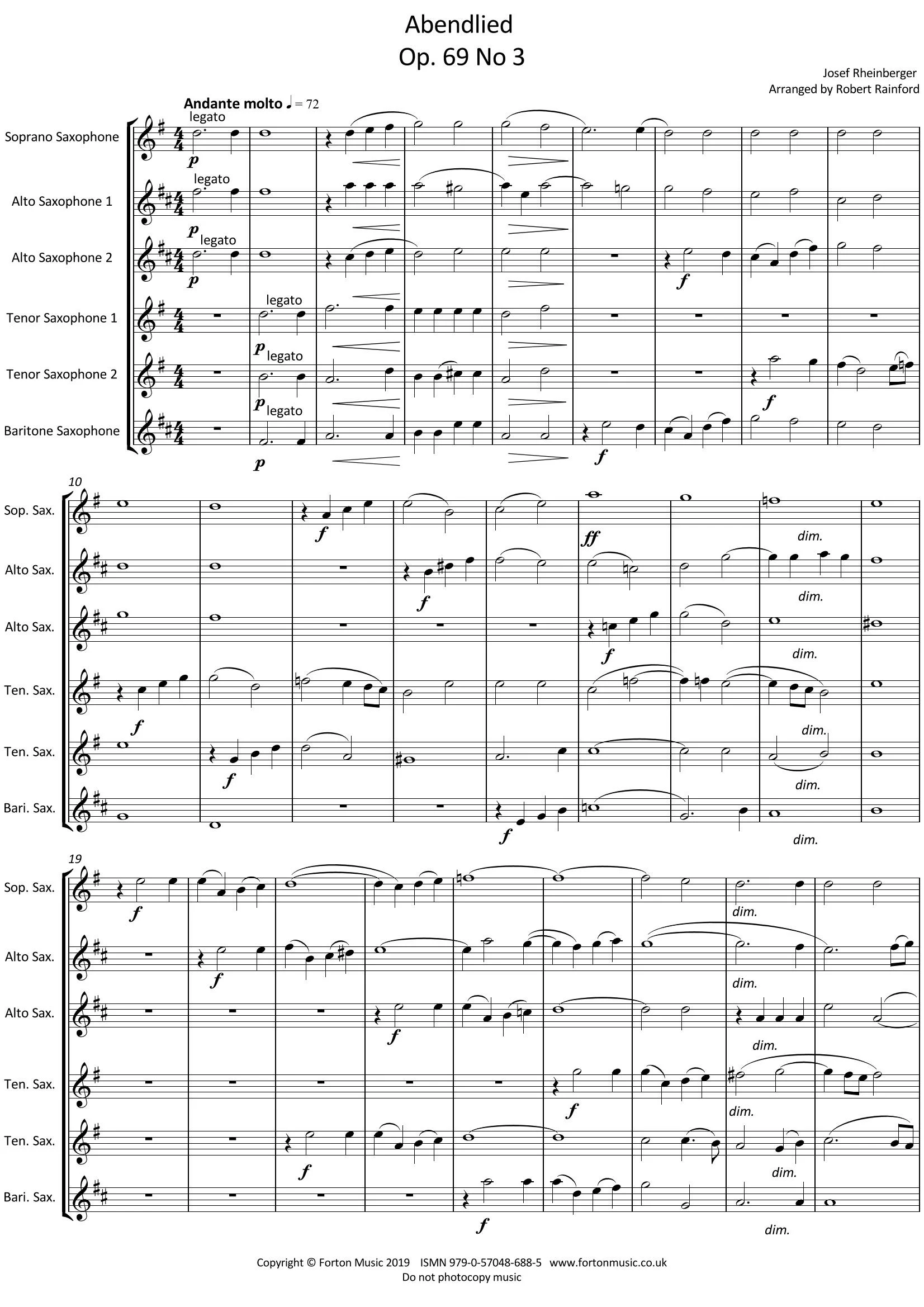 A relatively simple yet beautiful arrangement of a choral piece by Rheinberger. G major with an andante tempo marking. Chordal passages alternate with some simple counterpoint building to a magnificent climax in the middle of the piece. Players of about grade 3 standard should be able to get a lot out of this piece.