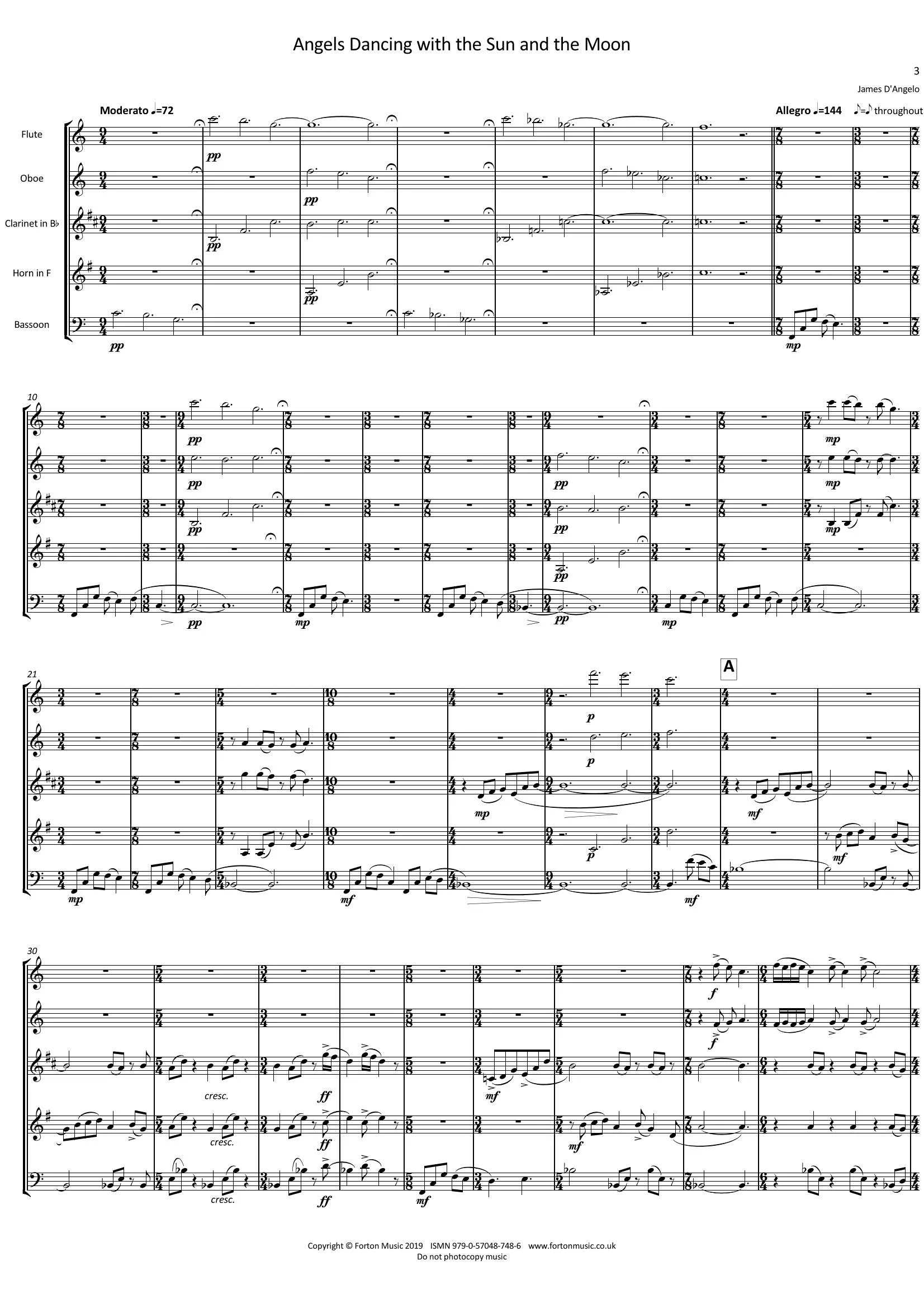 Written in January 2018 especially for the Roaring Fork Quintet who premiered the piece in a Bristol concert, the music depicts the swirl,, the improvisation and the freedom of the choreography of these seven dancing angels. This round dance of freedom is reflected in the music by the shifting time signatures.