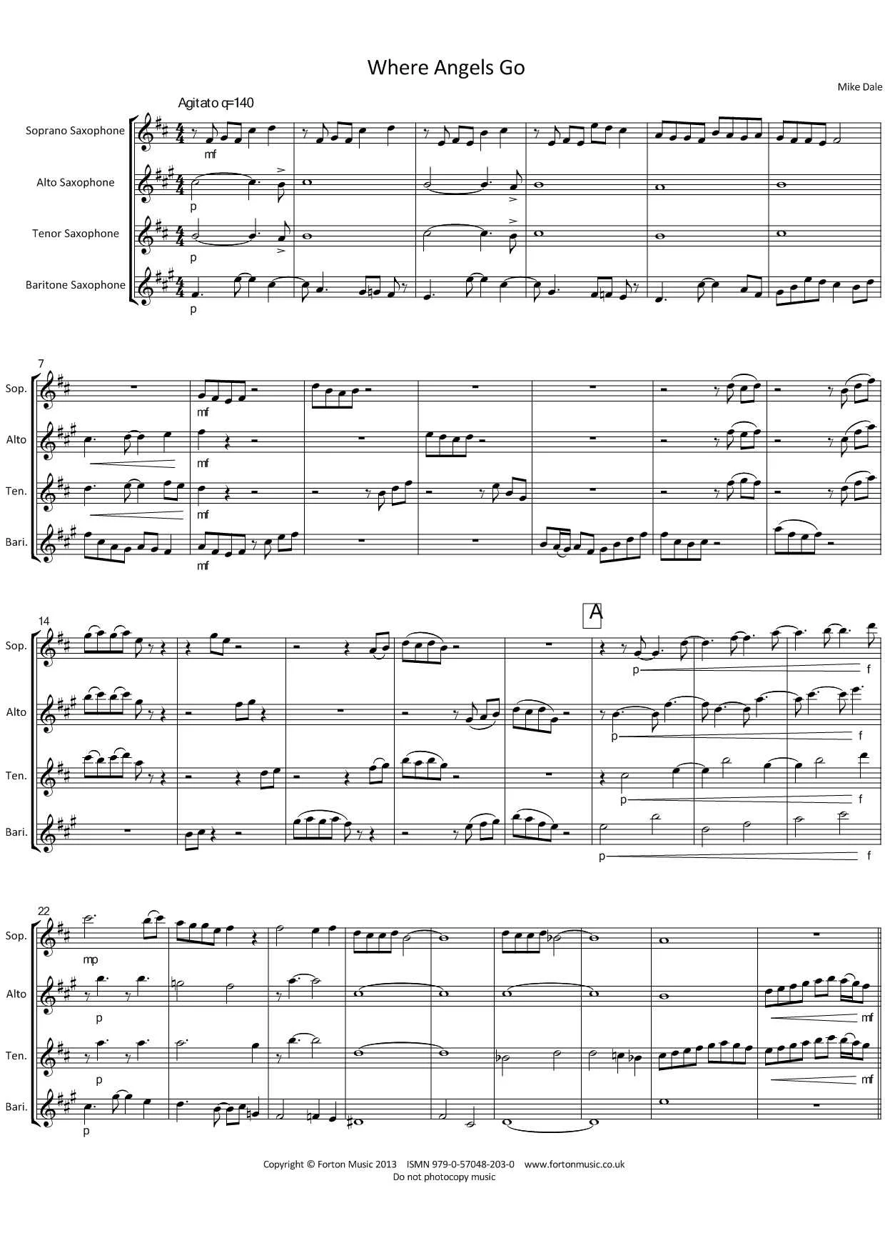 This piece has a distinct tango fell, with all players taking the lead at various times. After the intoduction, each instrument has a 2 beat solo. This is followed by a short section where the instruments play in twos and threes, with an inverted cascade of notes leading into the next section. When the main theme starts on soprano with alto harmony, the tenor has an equally important counter melody with a clear bass line on baritone.