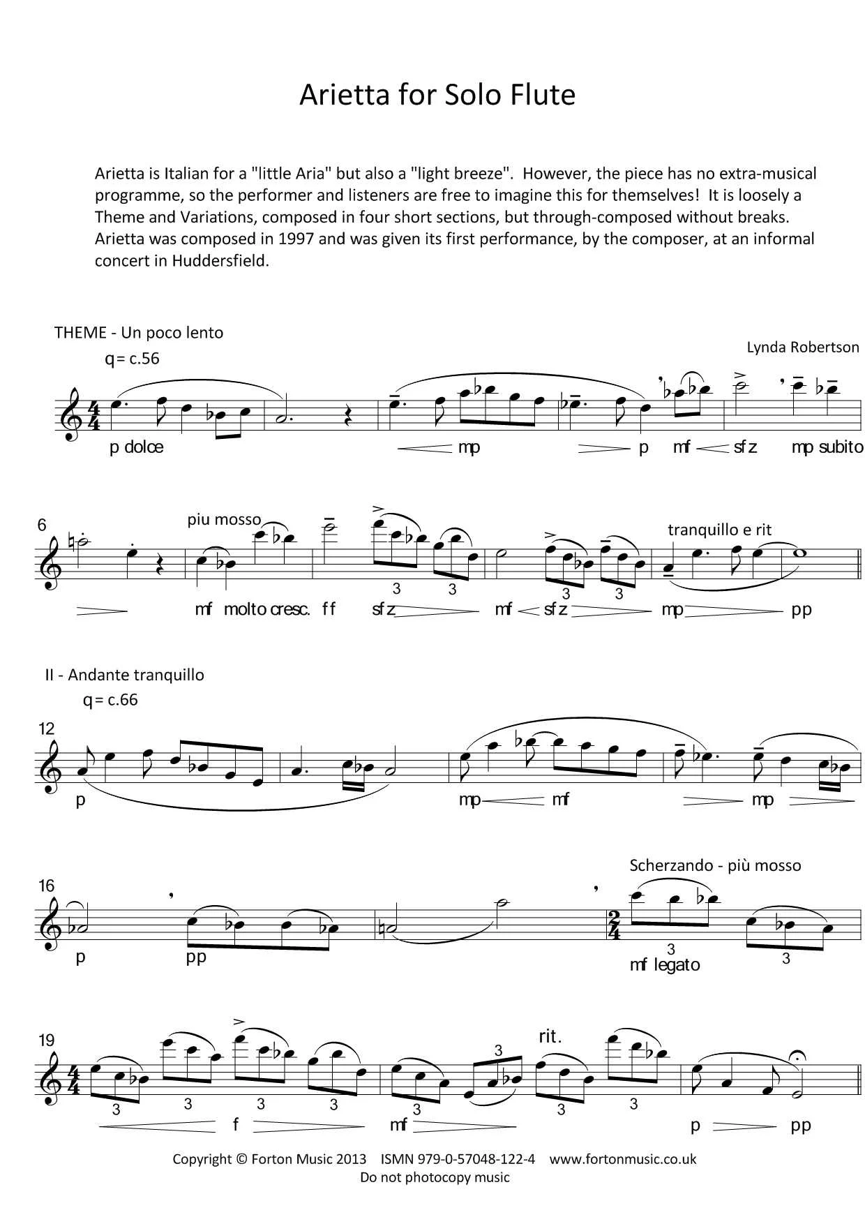 Arietta is Italian for a ‘little aria’ but also a ‘little breeze’. However, the piece has no extra-musical programmes, so the performer and listeners are free to imagine this for themselves. It is loosely a Theme and Variations, composed in four short sections, but through composed without breaks. An expressive piece, suitable for Grade 5 and above players.