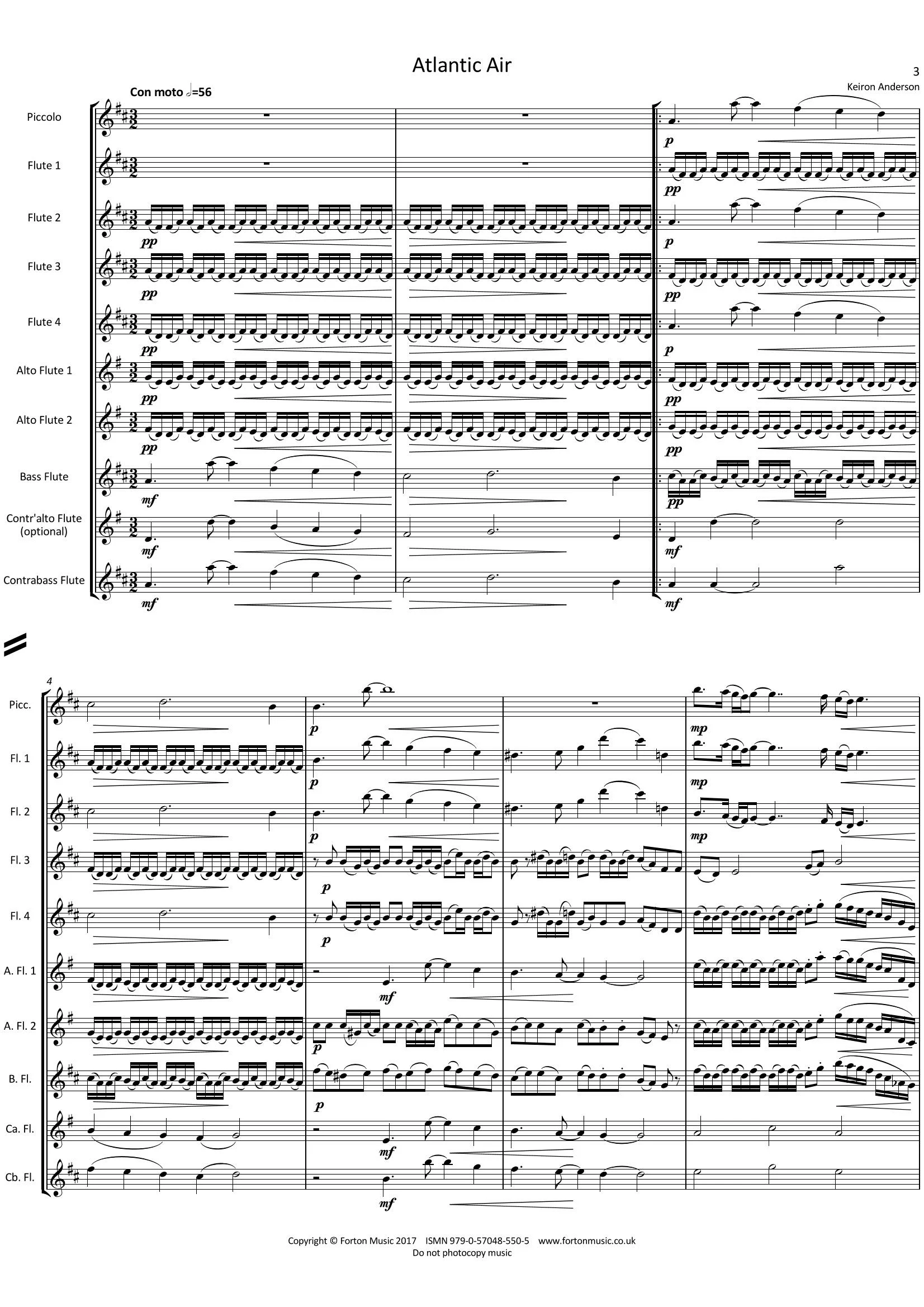 Atlantic Air was written for the 2017 Yorkshire Wind Orchestra Flute Day which is becoming a very well supported annual event for players from all over the country. The theme for this year is transatlantic music and so a flute choir piece which describes an ocean crossing seemed appropriate. The initial theme is accompanied by a motor cross-rhythm in semiquavers which almost simulates a 3/8 time ostinato, yet the main thematic material is a broad 3/2 syncopating to 6/4 at times. This represents engines working hard to produce fluid and flowing forward momentum. The second theme represents an arrival and a different, yet compatible culture. Once the theme has developed the recapitulation incorporates that culture by interweaving the themes and juxtaposing them on the journey back. There are good parts for all players and the work features the big flutes with melodic material from the outset.