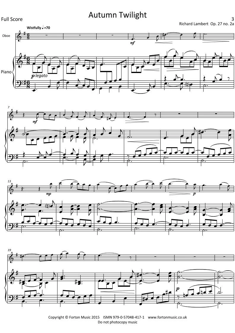 This piece is a reworking of the song ‘An end’ from the composer’s song cycle …too bitter sweet (Op. 27) and takes its title from a line in the Rosetti poem, which suggests an overall mood of regret and nostalgia. Based on a rising minor arpeggio in an E modal minor tonality, the main theme is varied slightly on each statement. Likewise the secondary motif, first heard in bars 27 to 30, is presented differently each time. Wistful throughout and unashamedly melodic, the oboe is in constant dialogue with the piano accompaniment.