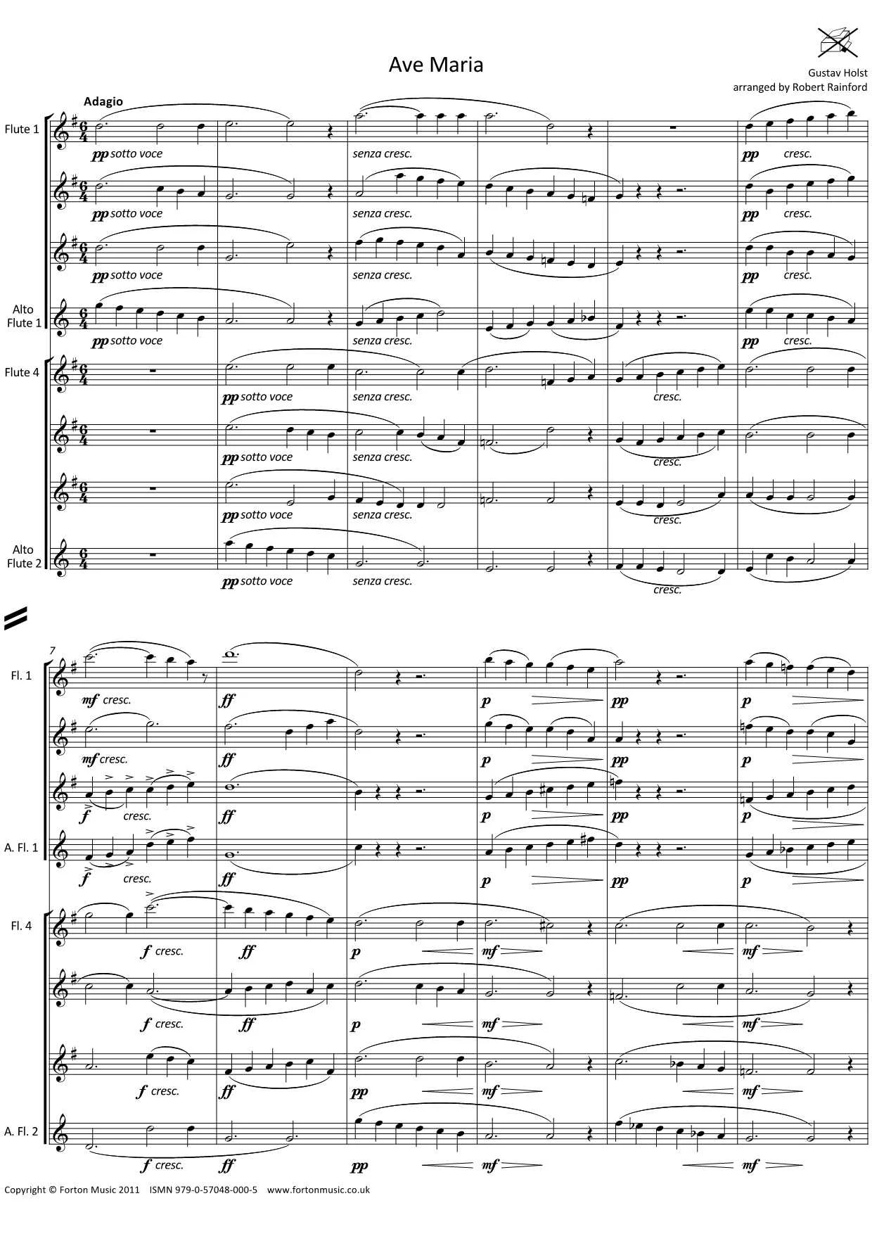An arrangement of one of Gustav Holst’s earlier works, originally for eight part women’s voices. Lush harmonies and simple flowing lines build to create a beautifully elegant sound world. The statement and answer sections mean that this piece works well antiphonally with the two quartets separated, but is just as good as a large choir piece. The relatively straightforward lines and simpler instrumentation make this an ideal piece for flute choirs that do not possess the larger instruments.