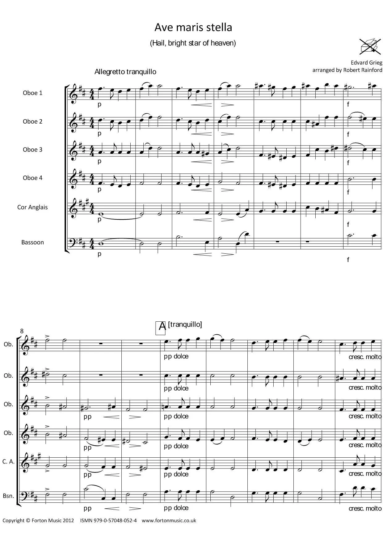 An ideal piece for the less experienced ensemble. 44 bars long with an Allegretto tempo marking, this was originally a choral piece which has been transcribed for Double Reed Ensemble. A useful concert piece. Oboe 1 up to top D, bassoon up to top G so maybe grade 4/5 standard.