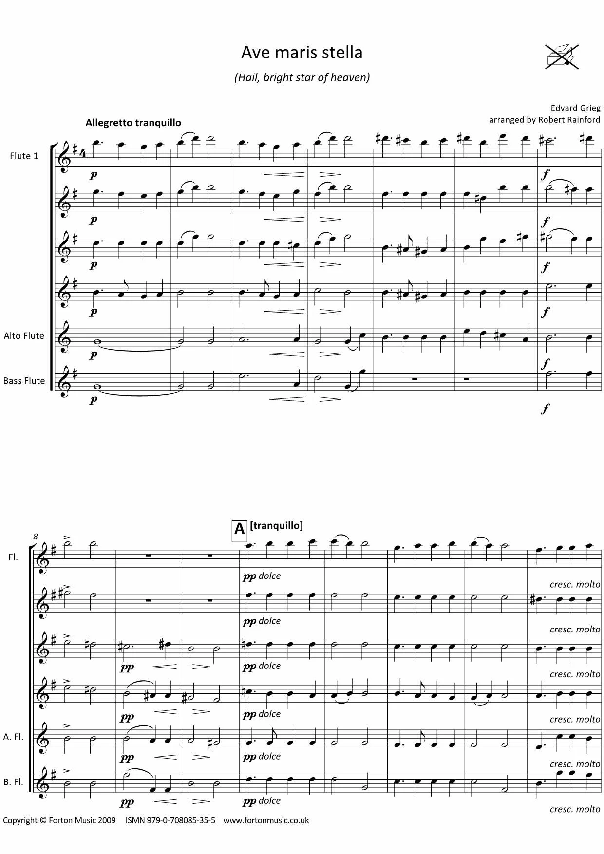 An ideal piece for the less experienced flute choir. 44 bars long in G major with an Allegretto tempo marking, this was originally a choral piece which has been transcribed for flute choir. Flute one and two reach top G, whilst the third and fourth part go no higher than 2nd octave D (although there are some A#’s to deal with). The alto and bass parts are very simple, allowing players less certain on these instruments to find their feet. The second half of this piece is an identical repeat of the first half, with flute one changing material with flute two, and flute three changing with flute 4. A useful concert piece.