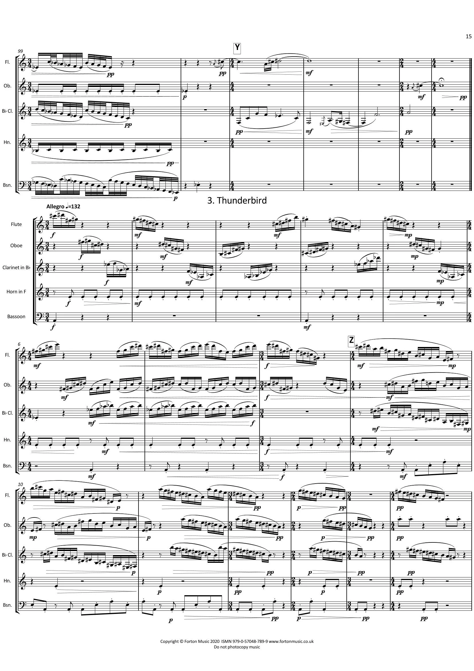 When I lived in Tallahassee, Florida, I often went walking in the park and the surrounding forest right outside of my apartment. The tall pine trees, the interesting bird songs, and the dense foliage all took away my sense of time or place. It would sometimes seem like I was transported to a mystical, ancient place outside of the world I was familiar with. This work, Axis Mundi is inspired by these experiences and my own general connection with nature. Axis Mundi was an LDS Barlow Commission for the Missouri Quintet. Axis Mundi refers to a connecting place between heaven and earth. In this work, I invite listeners to imagine strange, mystical spectres lurking in waters and forests. Despite the North American indigenous deities in the movements, this work is not meant to reflect a Native American perspective, rather, it reflects general ideas of nature that anyone could feel free to imagine in a mythological sense. In Native American mythology of the Great Lakes area, there was Thunderbird or the somewhat evil Underwater Panther: binaries, each living in worlds of their own connected to earth. The Thunderbird created lightning and lived in the overworld, whereas Underwater Panther was a cat-like water creature with horns and a spindly reptilian back that lived in the underworld, sometimes drowning people.