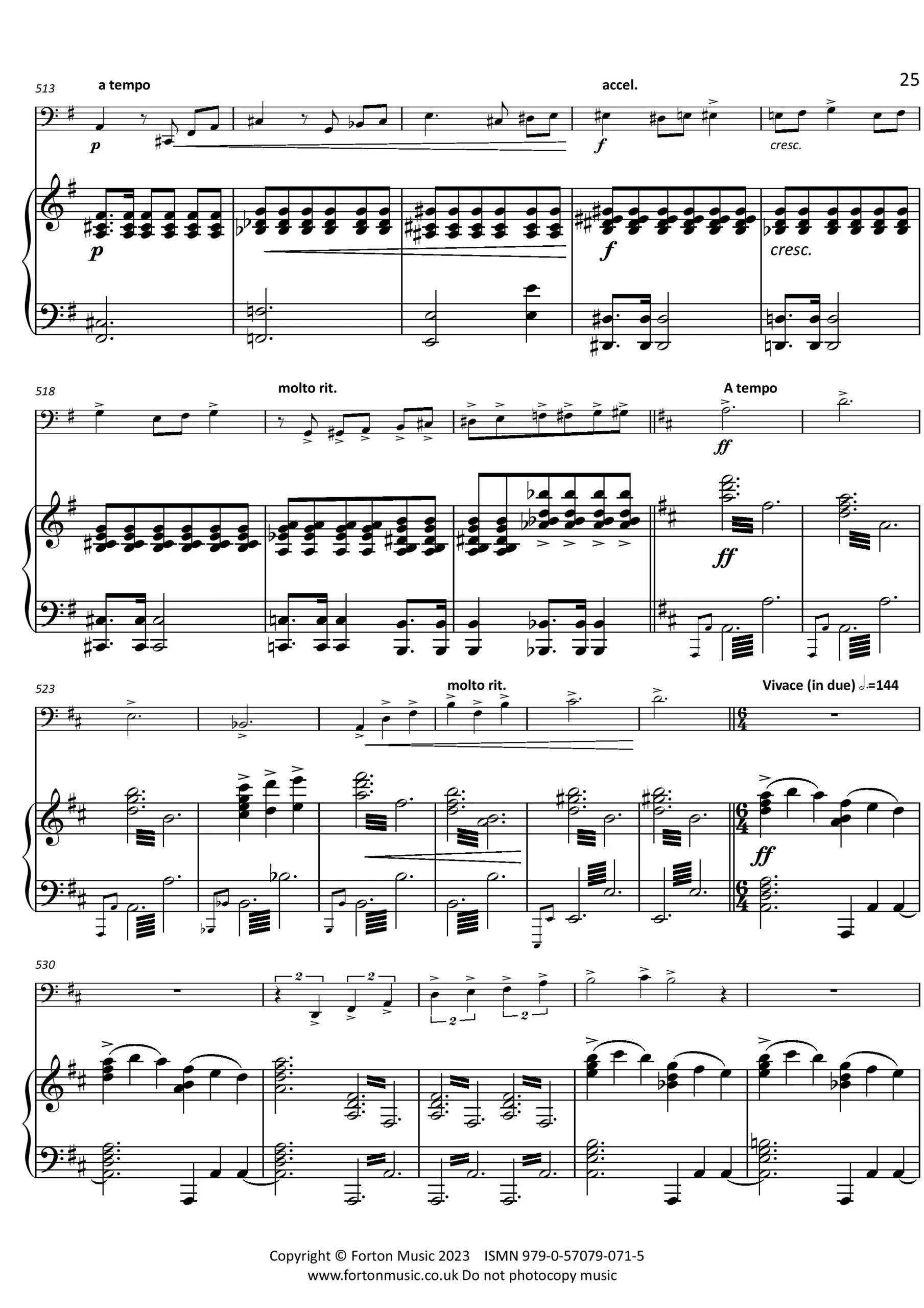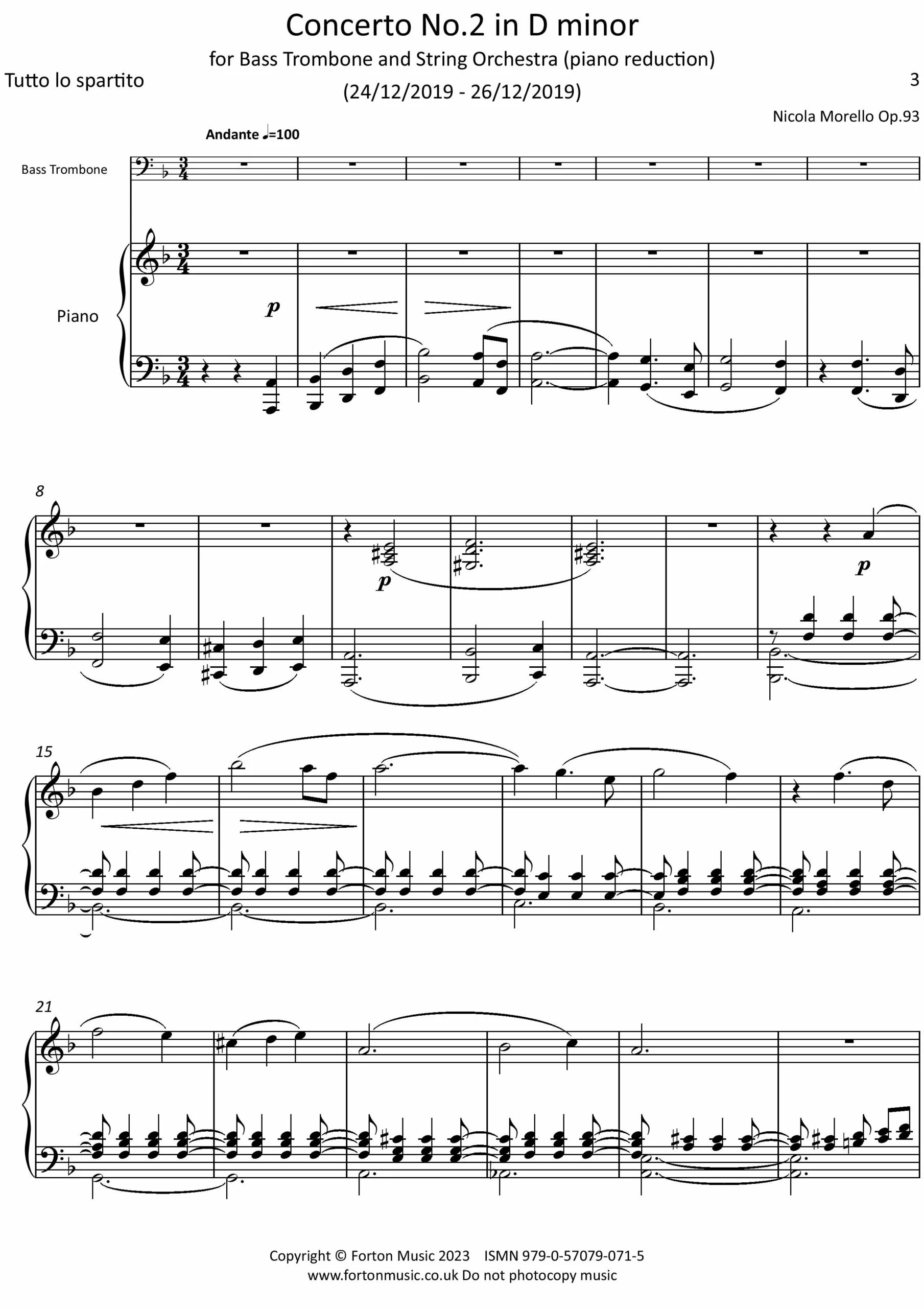 The Concerto No.2 for bass trombone and string orchestra is very different from No. 1. That concerto has a musical writing style and composition that encourages the trombonist to exercise his technical and musical abilities while seeking dialogue between the two parts. In this concerto, trombone and orchestra are equal, where musical discourse shifts from one instrument to another in search of coherence and unity of intent. The three movements are linked and derived from each other. Handling this concerto and its expressiveness requires a great deal of maturity on the part of the trombonist. The most important point is definitely the Adagietto. You don’t have to look for broad musical phrases, but you do need to look for fragments and for the uncertainty of beat rhythms. The orchestra and trombone are a harmonious set of colors which must be appreciated as a harmony as such. Nothing less and nothing more.