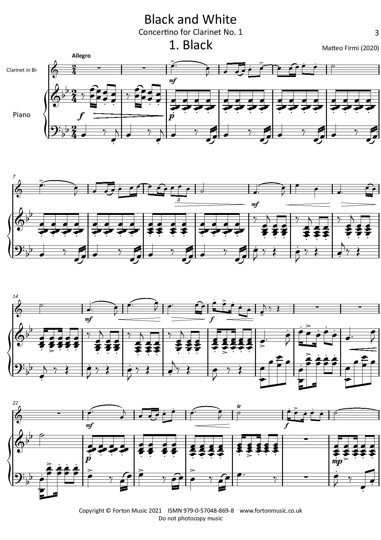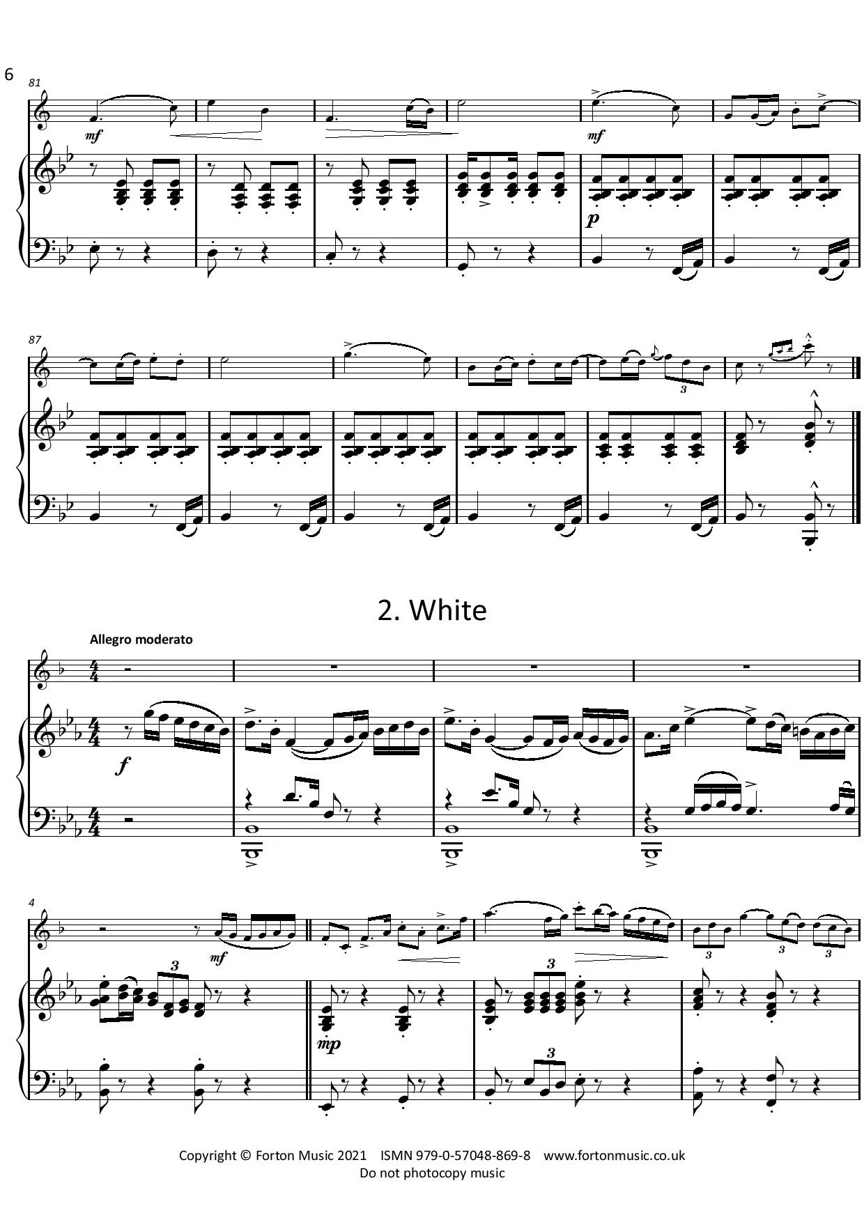 The first movement (Black) starts with a bright melody with some ragtime-like touches. This then gives way to a slower more lyrical section with a Balkan feel to some of the harmonies. After a brief cadenza, this then returns to the opening idea to finish. The second movement (White) is a showcase for the instruments versatility, with flashy scale and arpeggio patterns alternating with declamatory, almost operatic statements.
