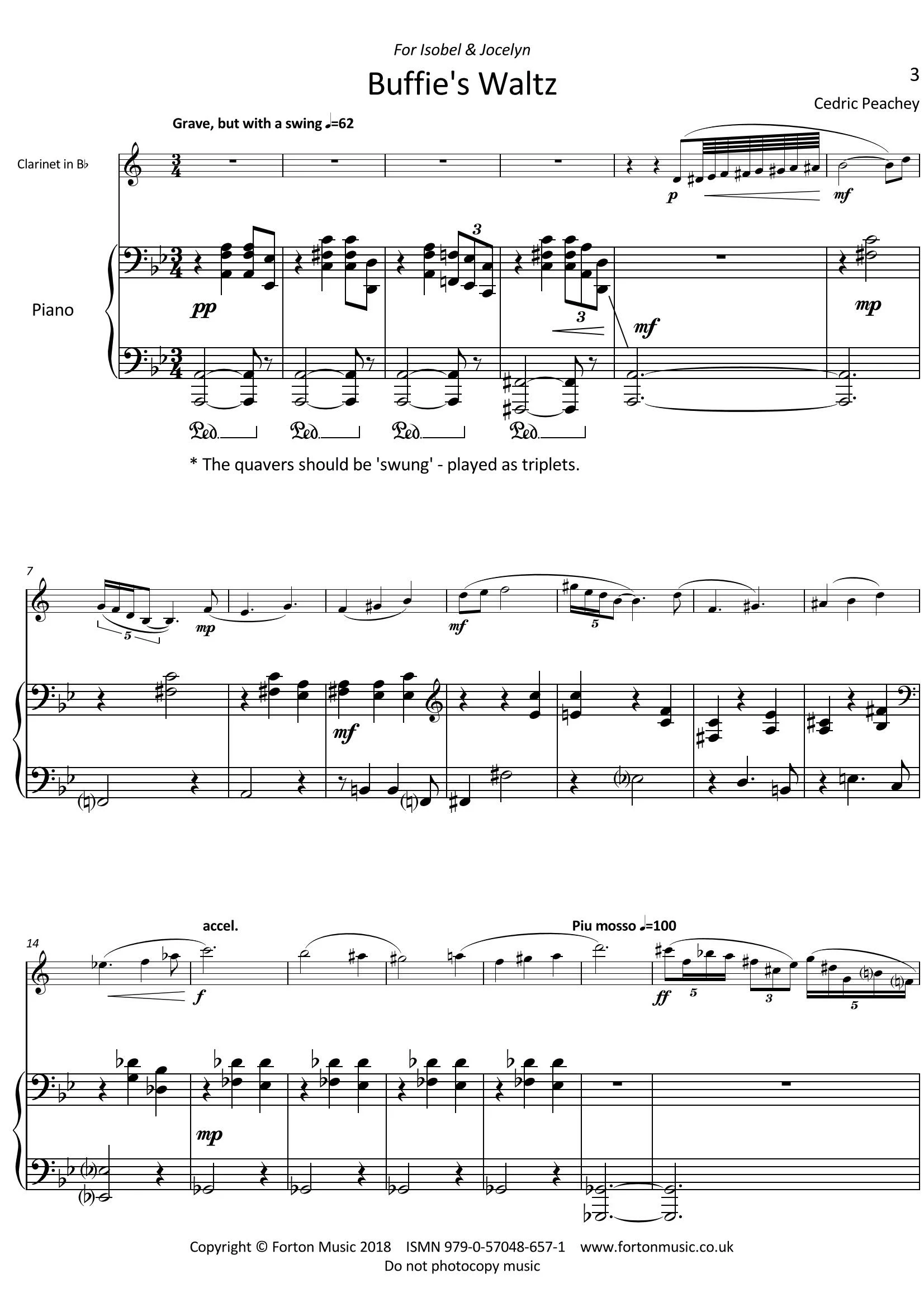 The Monington Duo – Robert Blanken (clarinet) and Karen Kingsley (piano) – gave the piece’s first two performances in 2006, initially in Portsmouth and then in London. A critic who attended the London concert gave his impression of the work: “The concert finished with Cedric Peachey’s Buffie’s Waltz; a sardonic, witty finale inspired by a certain American television programme. The constantly lurching tempo and clarinet writing moving from fruity low register to the very highest squeals conjured a wise-cracking, nightmare world from which we were suddenly woken with a side-slipping ending.”
