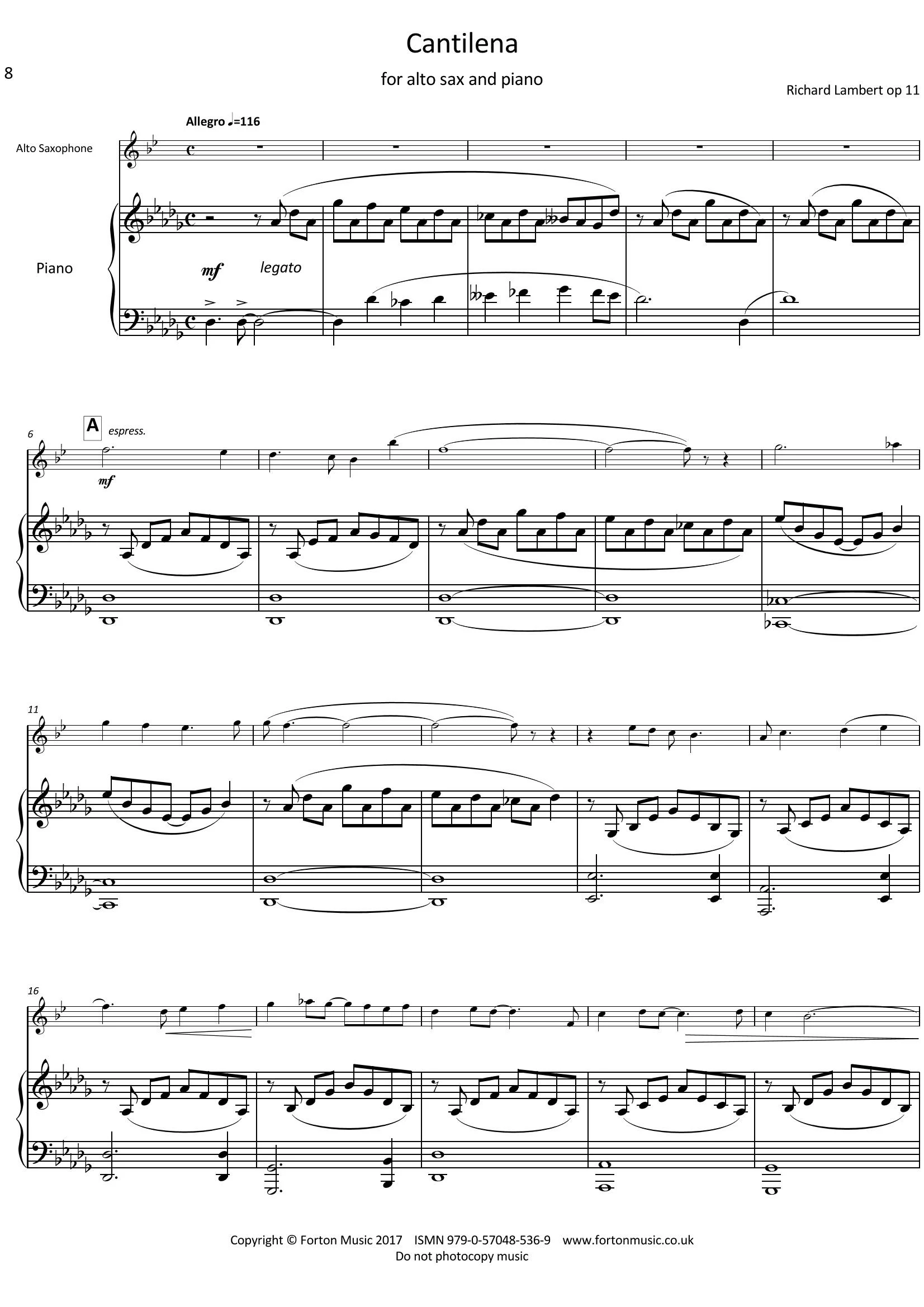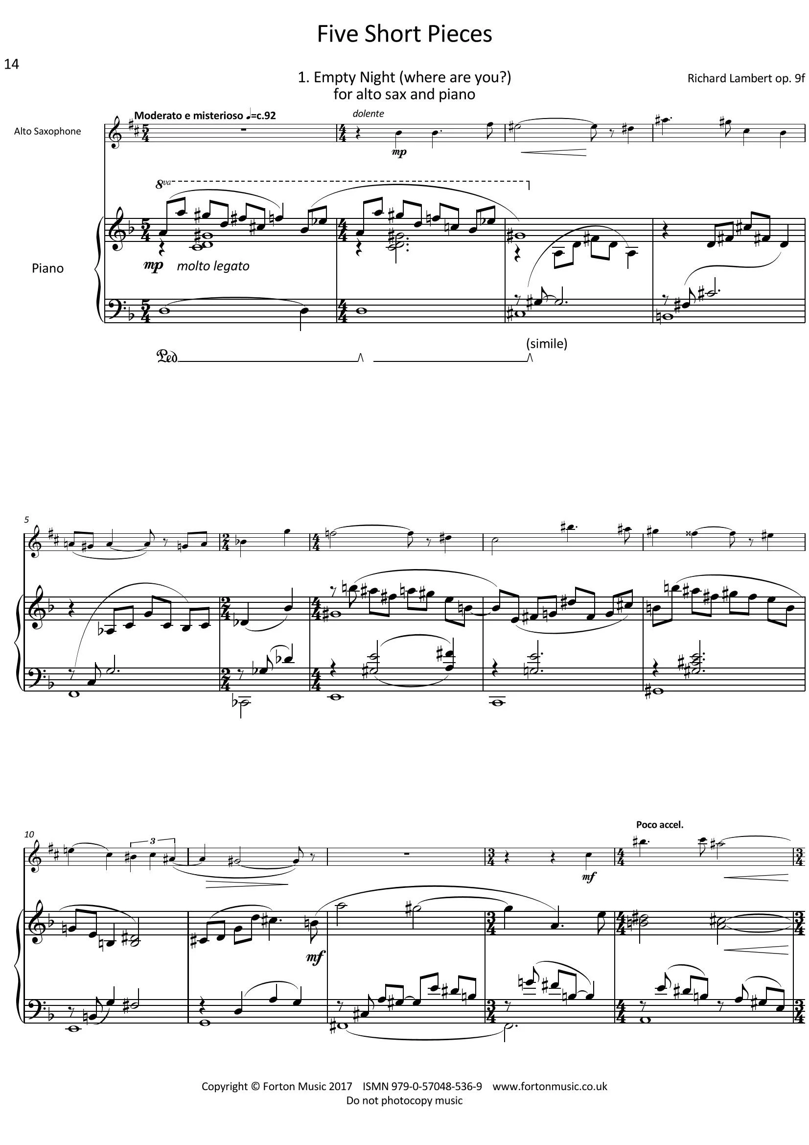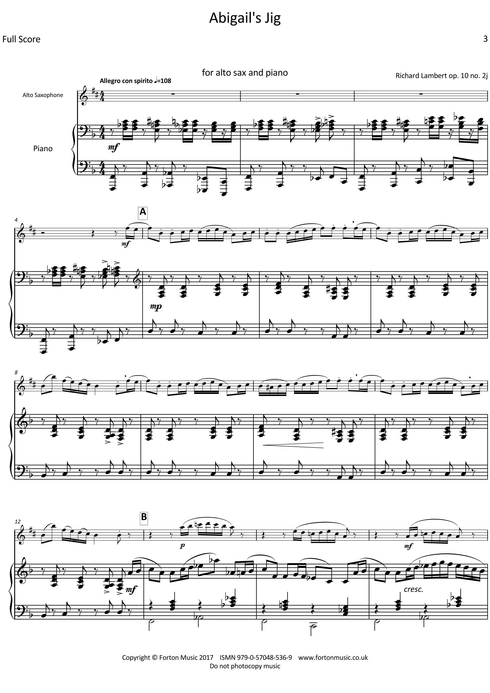 Abigail’s Jig, op. 10 no. 2j Originally composed for flute and piano in 1980 to celebrate the birth of Abby, the composer’s daughter, this version for alto saxophone was written in 2017. It attempts to capture the atmosphere of an Irish jig as played by a piper, with a harmonically straightforward piano part, which uses a mixture of ‘vamping’ and melodic imitation of the sax part. The introduction is intended to be humorous and rather musically misleading, openly parodying the ‘cowboy’ music of Aaron Copland. Modal harmony helps to create the mood of pseudo-folk music. Cantilena, Op. 11 Cantilena tries to capture a popular flavour, borrowing freely from pop and jazz styles: primary and secondary chords are used in arpeggiated piano figures, as mainstream ballads might do; pedal notes are a feature, especially on the tonic note; and a ‘bluesy’ style emerges in the third main theme. A pseudo-rock style is twice used in the climax section, which acts as a song-like chorus. Cantilena is in the key of Db major overall, but even the introduction uses ‘wrong note’ harmony (notably flattened sevenths) to produce ambiguous tonality. The piece, written in 1987, demonstrates a range of tone colour for the sax across a wide melodic range. Five Short Pieces, Op. 9f This set of pieces was originally composed for flute in 1985, and arranged for sax in 2017. They are elaborate transcriptions of To One, five songs to poems by Christina Rees, which convey the countless moods associated with a relationship. Abigail’s Jig has been set by the ABRSM for Grade 7 Saxophone from 2022.