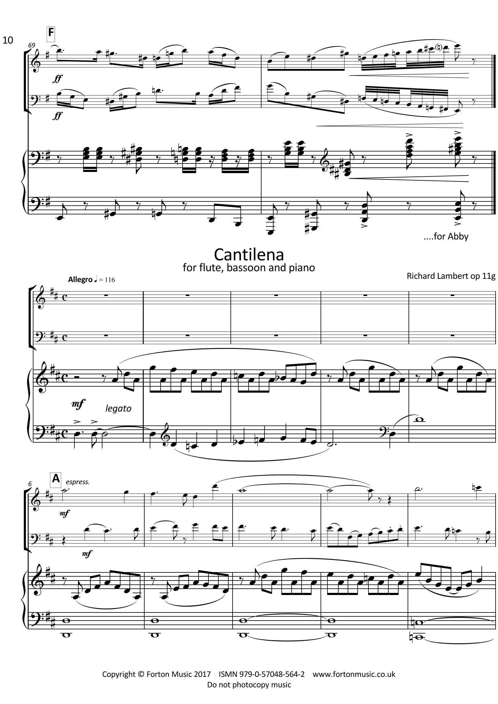 Cantilena, Op. 11g tries to capture a popular flavour, borrowing freely from pop and jazz styles: primary and secondary chords are used in arpeggiated piano figures, as mainstream ballads might do; pedal notes are a feature, especially on the tonic note; and a ‘bluesy’ style emerges in the third main theme. A pseudo-rock style is twice used in the climax section, which acts as a song-like chorus. Cantilena is in the key of D major overall, but even the introduction uses ‘wrong note’ harmony (notably flattened sevenths) to produce ambiguous tonality. The piece demonstrates a range of tone colour for both flute and bassoon across a wide melodic range. Written originally for alto sax in 1987, the piece was arranged for this combination in 2016.