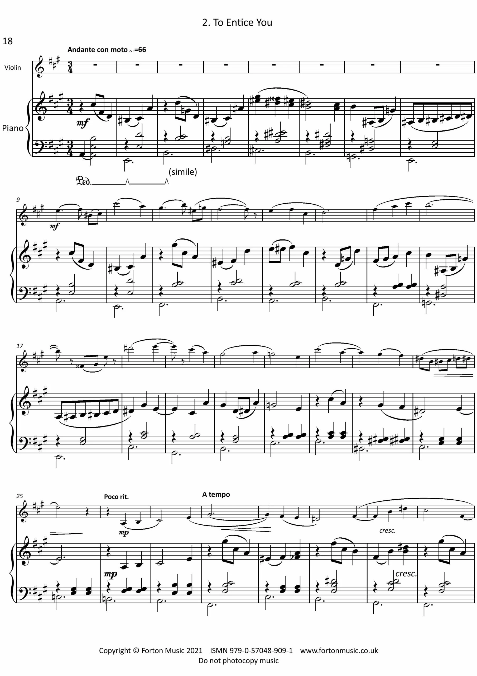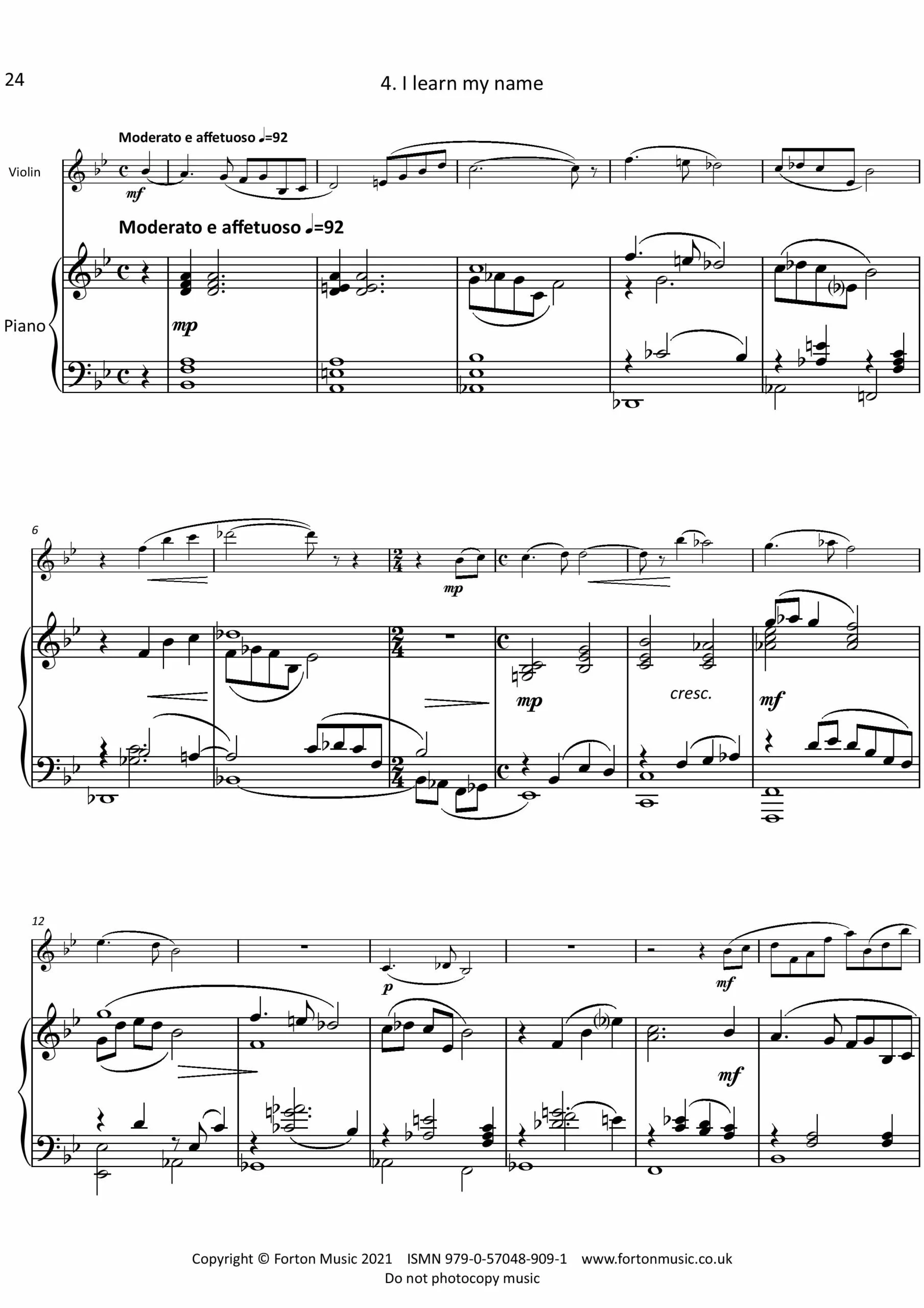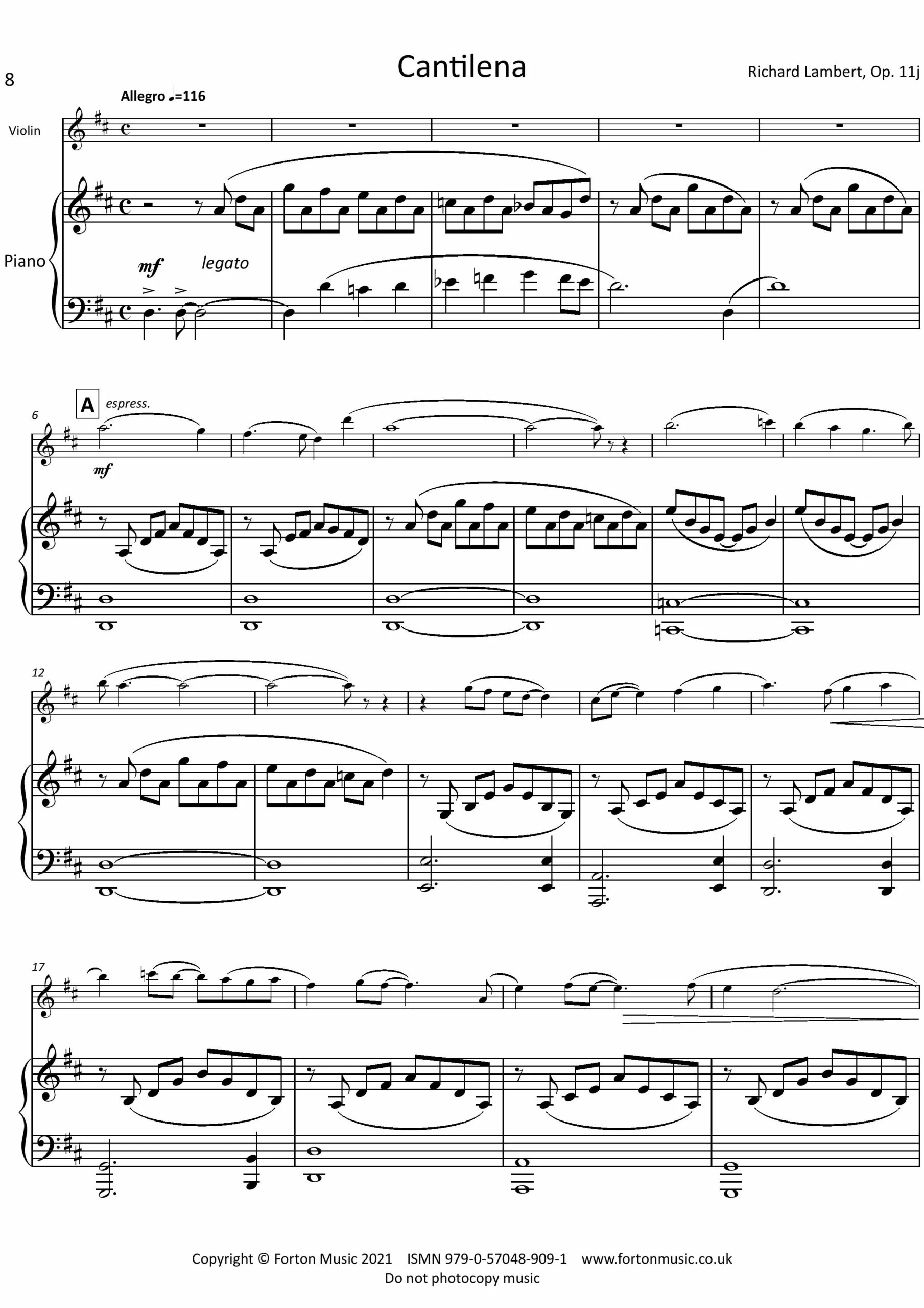 Cantilena, Op. 11j Cantilena tries to capture a popular flavour, borrowing freely from pop and jazz styles: primary and secondary chords are used in arpeggiated piano figures, as mainstream ballads might do; pedal notes are a feature, especially on the tonic note; and a ‘bluesy’ style emerges in the third main theme. A pseudo-rock style is twice used in the climax section, which acts as a song-like chorus. Cantilena is in the key of D flat major overall, but even the introduction uses ‘wrong note’ harmony (notably flattened sevenths) to produce ambiguous tonality. The piece demonstrates a range of tone colour for the violin across a wide melodic range.