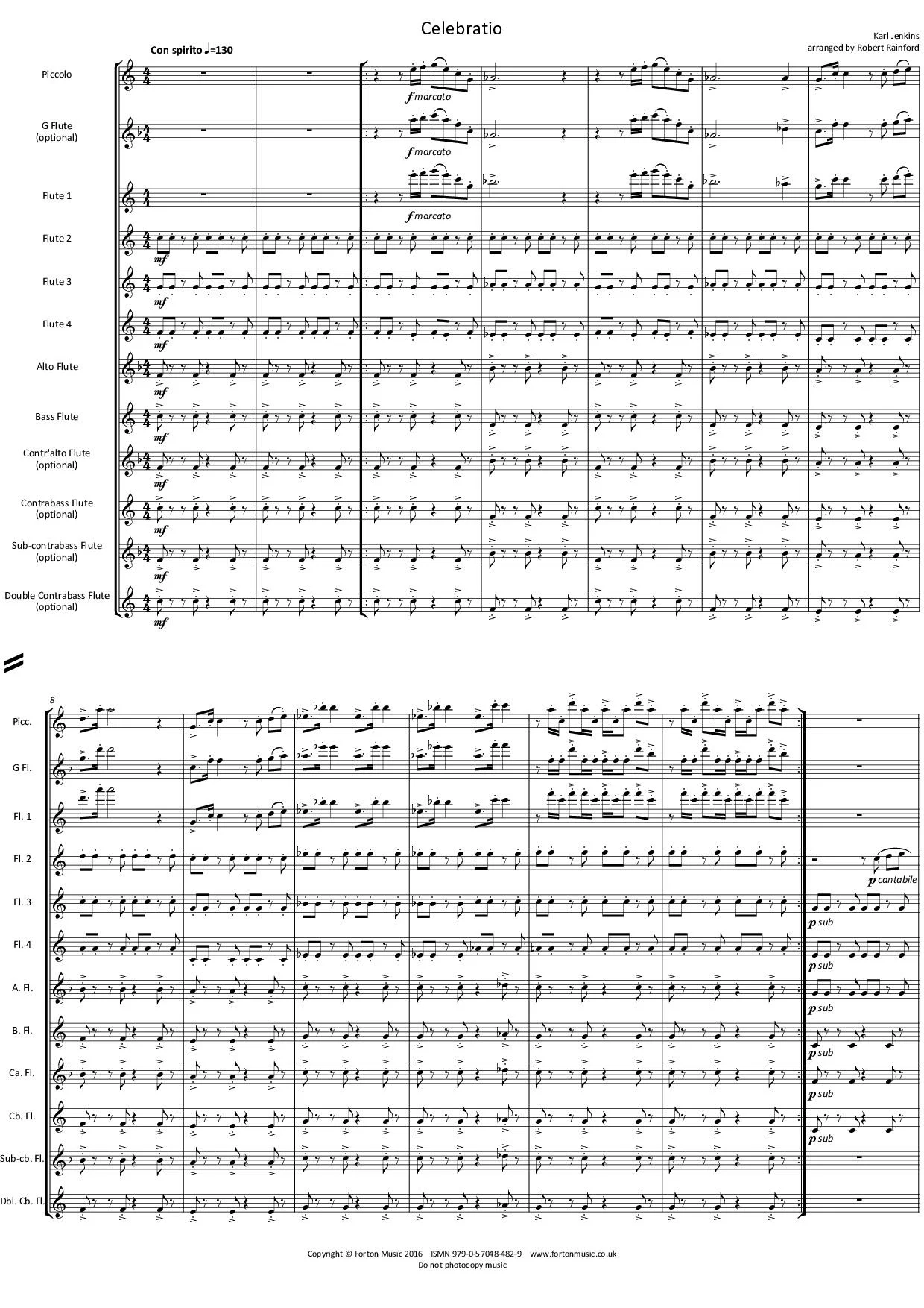 This is an arrangement of a short organ piece. It opens with short, driving ostinato figures in the lower parts, with a bright and exuberant theme in the highest parts. This then changes to a slightly more relaxed and singing middle section, which builds through a very short syncopated section to a full throated reprise of the first section. The piece ends with a fanfare for all the flutes! With optional parts for just about every member of the extended flute family, and the simpler parts for the lower flutes, this is a great concert item for any flute choir.