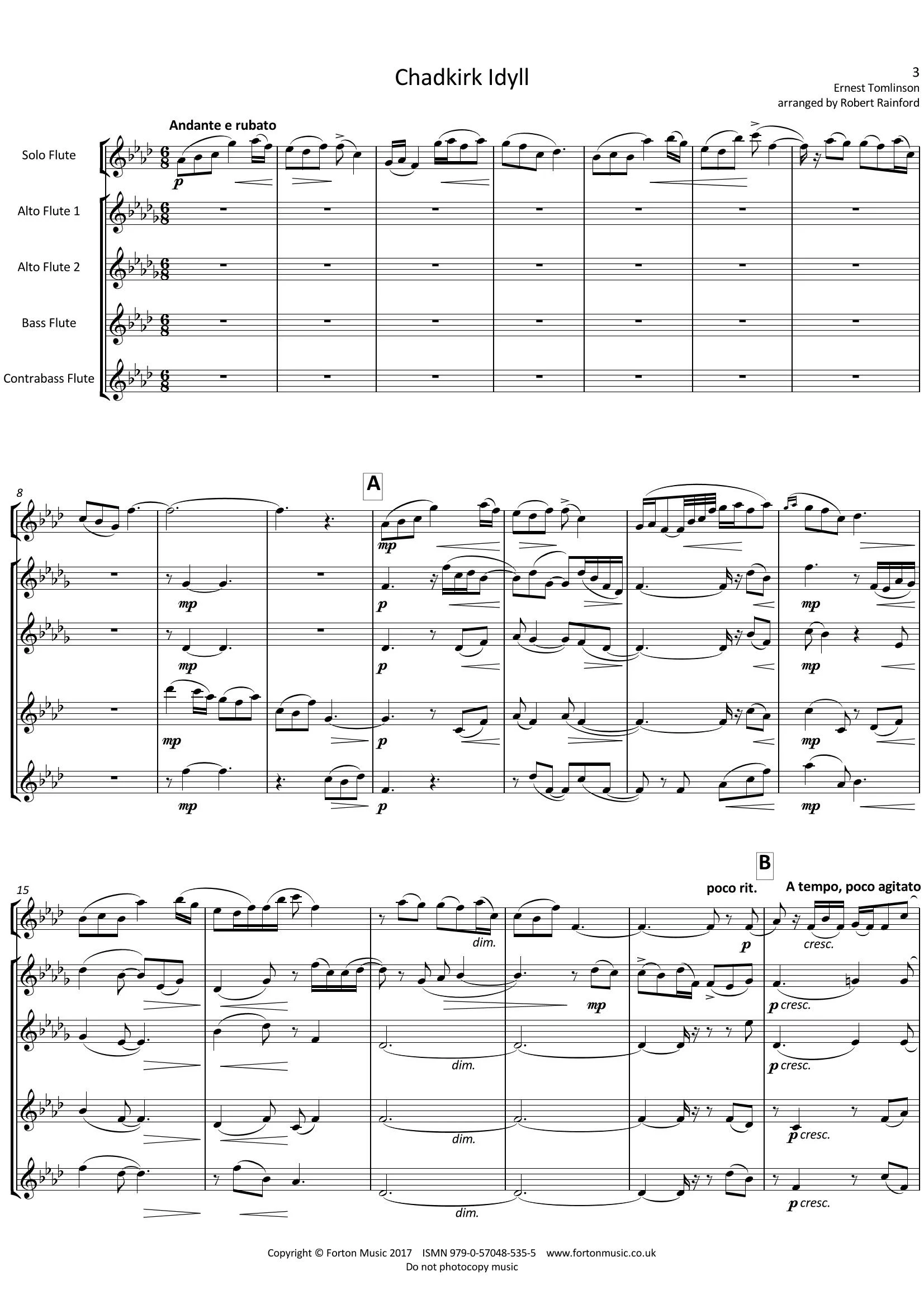 One of Tomlinson’s last compositional works, Chadkirk Idyll was commissioned in 2002 as a duet for recorder and guitar, and shortly afterwards rescored for recorder and string quartet. That version has been used to create this arrangement for solo flute and low flute quartet. The piece is also available for the more usual combination of flute and piano.