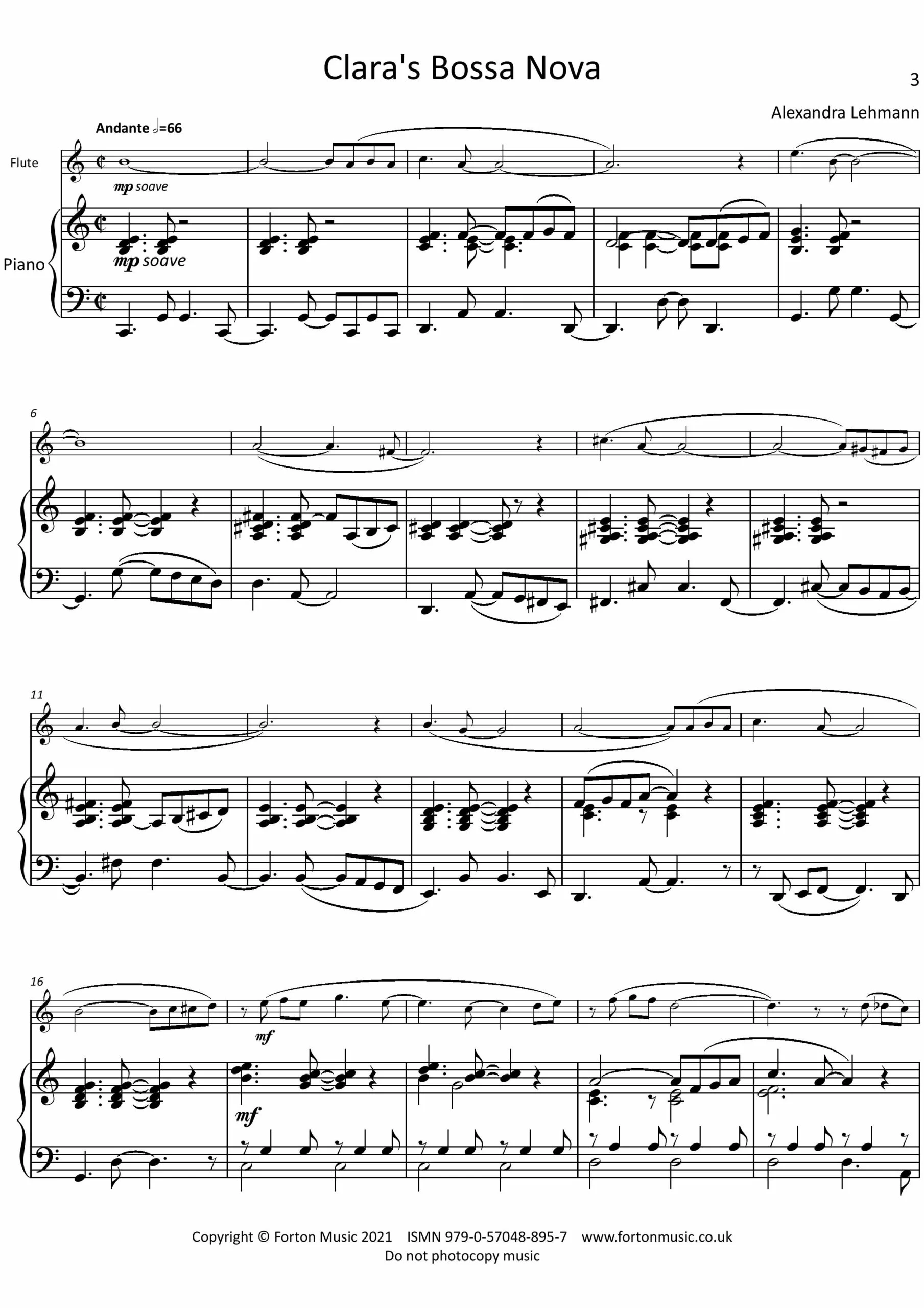 Whilst living in São Paulo in the late 1990s, where I played viola with the Opera Orchestra, I discovered Bossa Nova with its Jazz chords, syncopated rhythms, and sinuous melodies. There was also Samba Batucada everywhere: in the streets, cafés, office courtyards…Music was a communal and all-encompassing activity, with dance, costumes, at times song and/or chanting, and religion, such as Candomblé. I saw performances by street children and community clubs, all exhilarating with energy and a love of music. My daughter, Clara, has Brazilian heritage. Like Bossa Nova, she has that natural Brazilian swing, so this is composed for her.