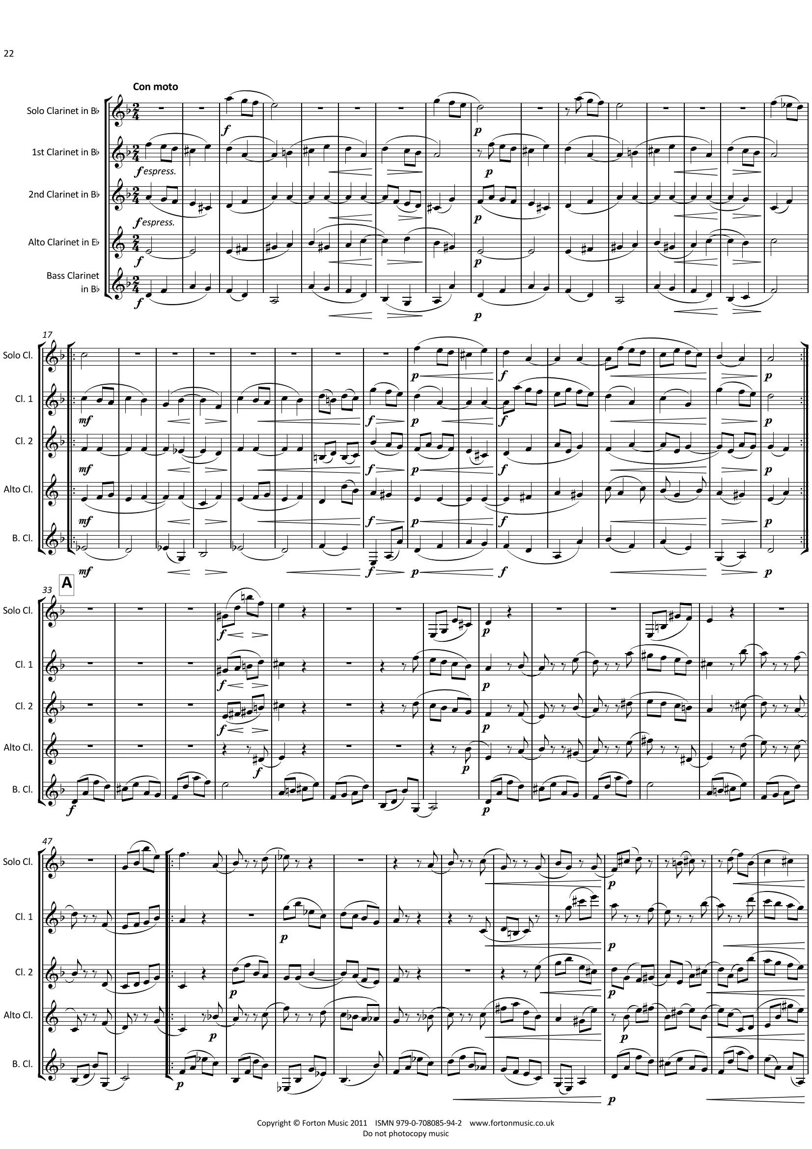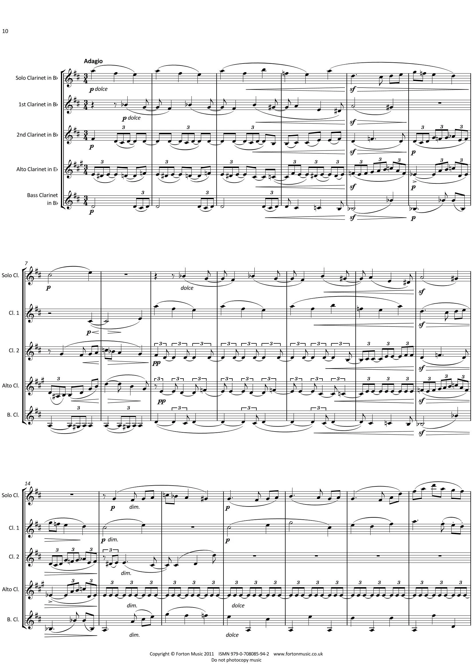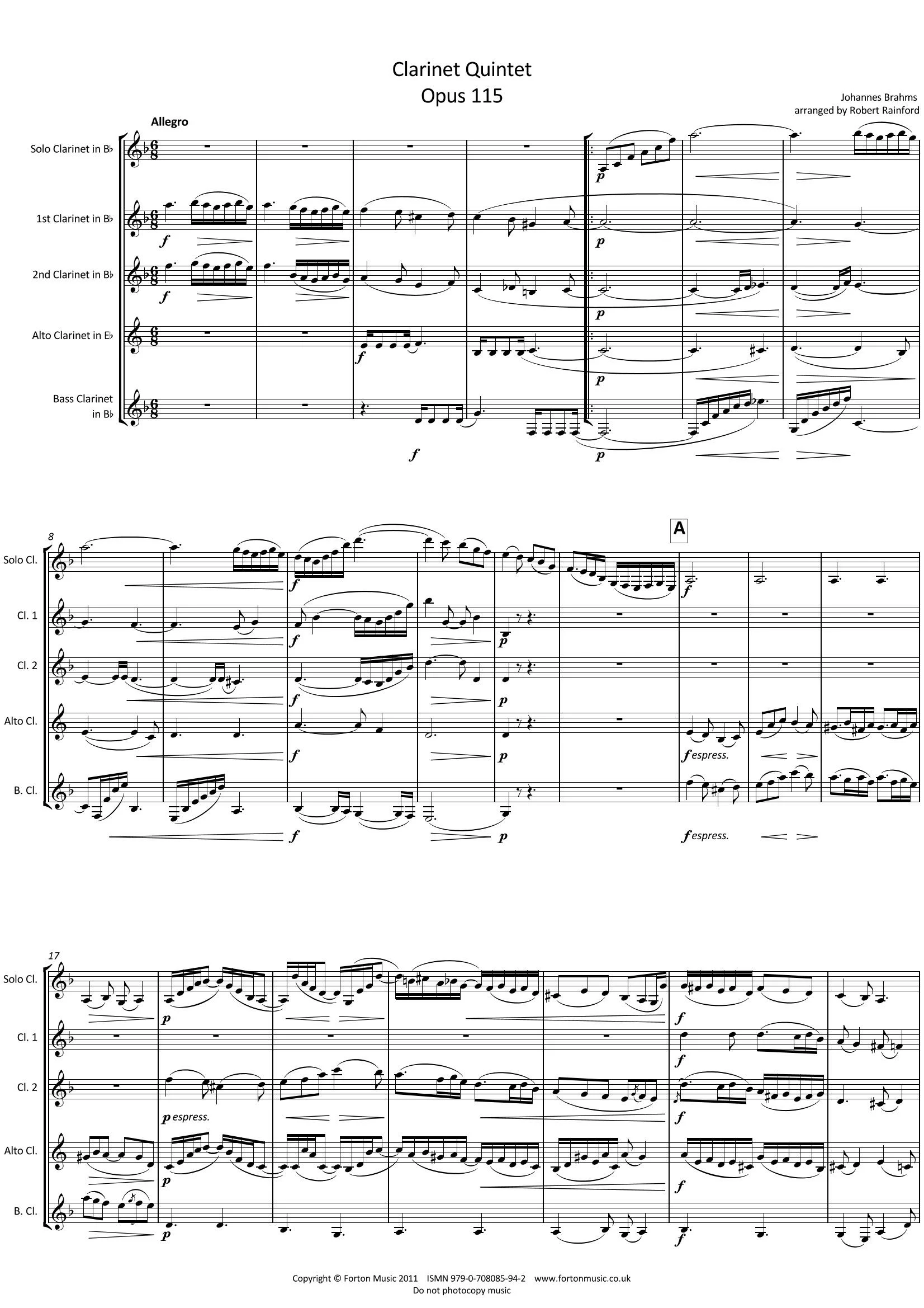 Solo Clarinet and Clarinet Quartet (2 Bb clarinets, alto/Bb. bass clarinet). A full arrangement of Brahms’ famous clarinet quintet Op. 115. The solo part has been transposed for clarinet in Bb, but the keys have been changed so that the fingering remains consistent with the version for clarinet in A. As one would expect from Brahms, this work is technically challenging in all parts. The full range of every instrument is explored, and this is a rhythmically complex piece requuiring a high degree of musicianship to perform well. Nevertheless, this is a piece of standard clarinet repertoire now presented in a new combination of instruments, hopefully making it more accesible to a wider range of players. Well worth the work.