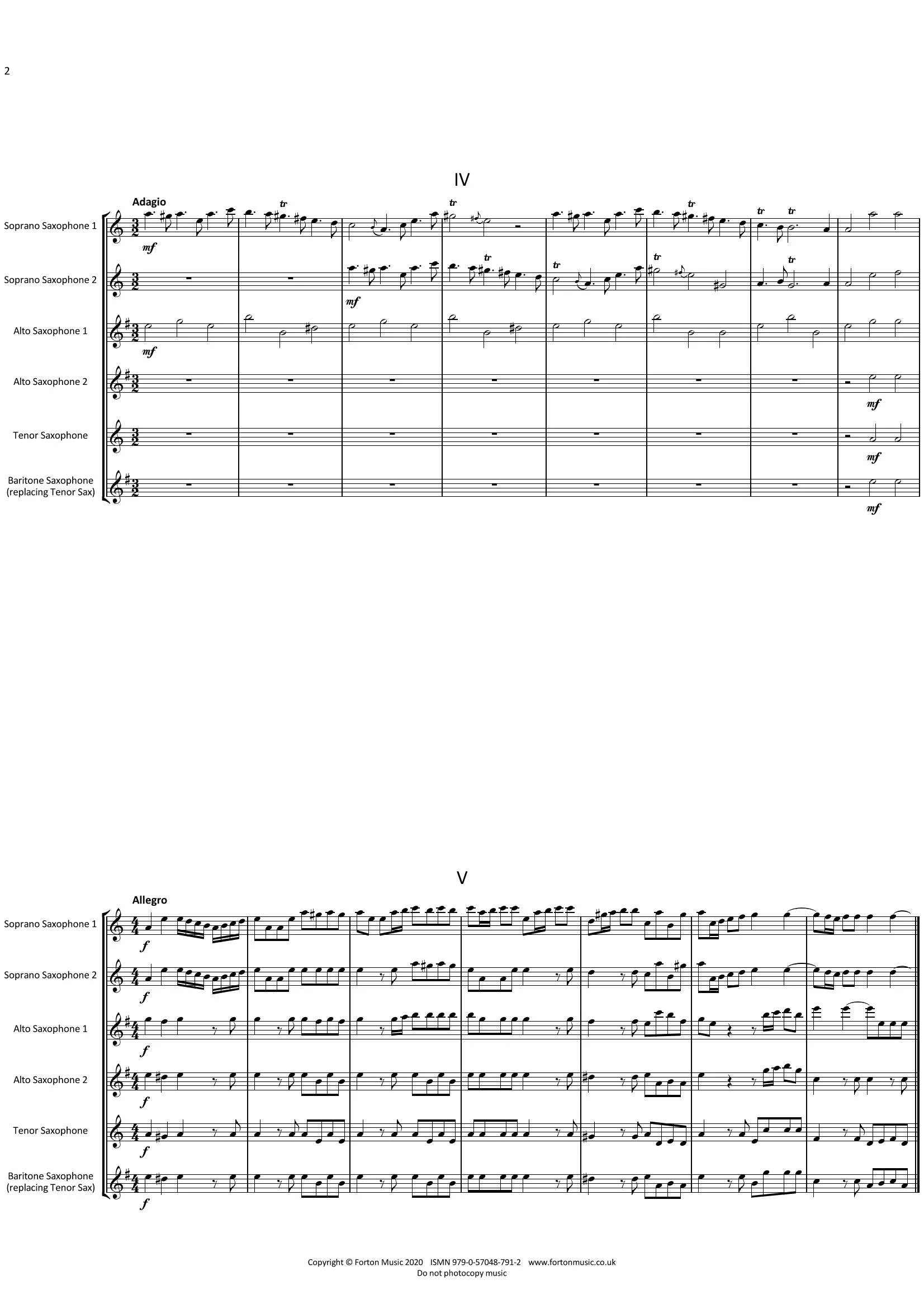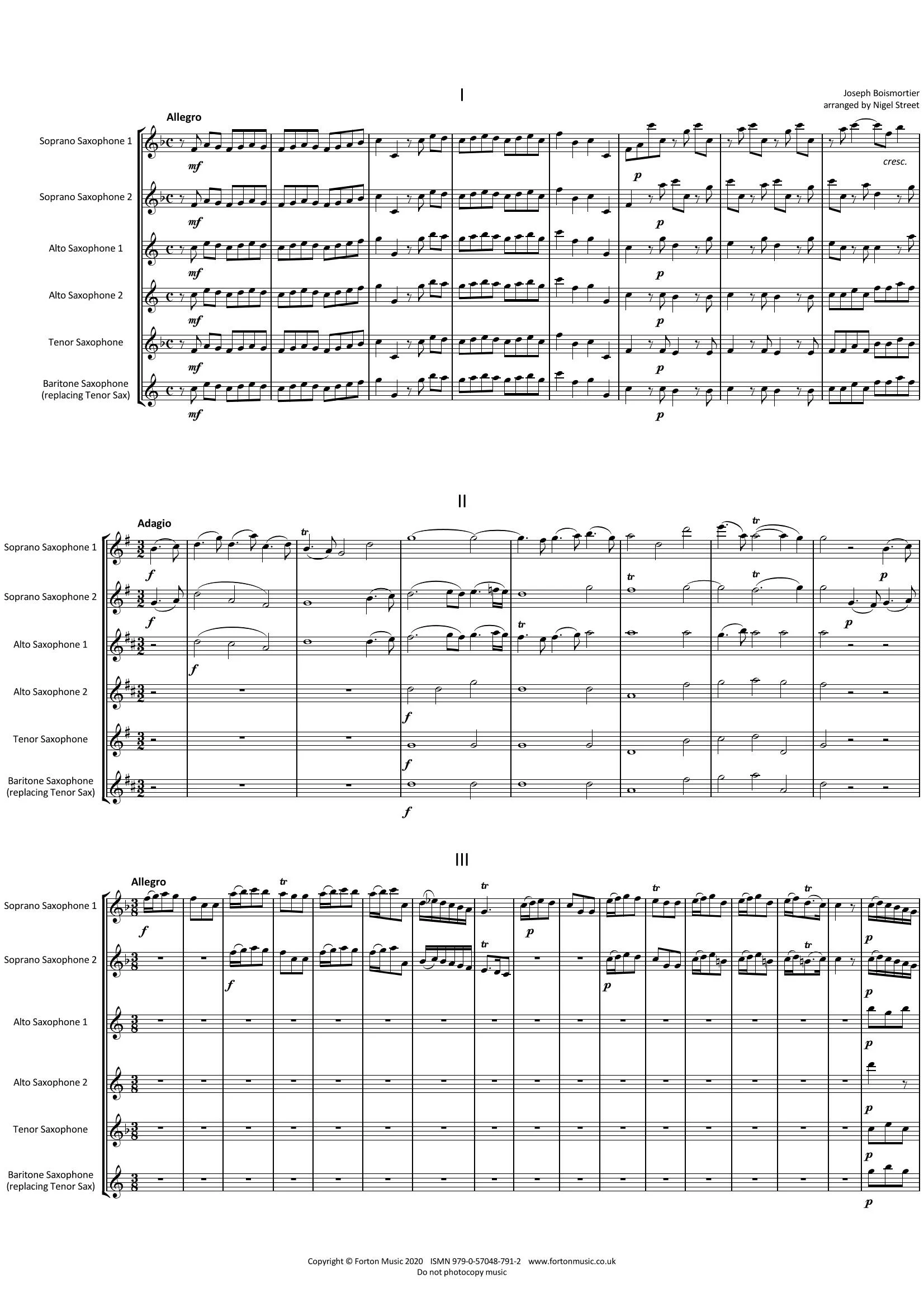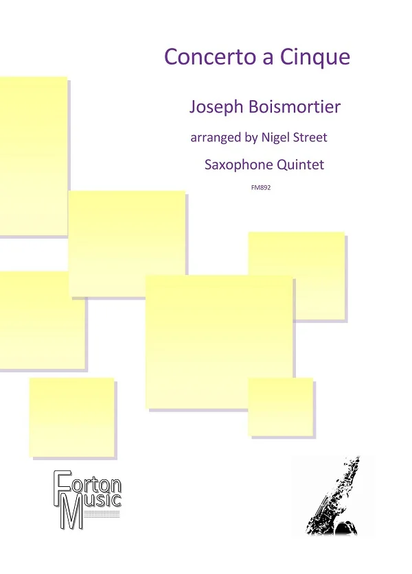 These pieces were composed by Joseph Boismortier sometime around 1720. They were taken up by the famous French flute player Jean-Pierre Rampal. He recorded all five parts in what some people believe to be the first example of over dubbing on one recording. The recording was taken up by the French Resistance during the war, and was broadcast on the radio as a code to the resistance members. When I was twelve years old I very much enjoyed playing these pieces with my flute playing friends, and when I recently came across an old copy in my music cupboard, I started to wonder if saxophone players would also enjoy playing them. But instead of playing them on five equal saxophones, I thought it would be good to arrange them for two soprano saxes, two alto saxes and a tenor or baritone playing the fifth part. By using the 2 sopranos and the two altos, it becomes possible to get an antiphonal effect during the performance. This is a section of a piece of music sung, recited, or played alternately by two groups. So far I have arranged five movements from two concerti which I hope that saxophone players will enjoy playing. They are probably for more advanced players, who would enjoy working on some baroque type music and learning about the different performance techniques required. Personally I think that saxophones are eminently suited to baroque music because they can create the same family of sound, that you can also get from a brass choir playing this style of music that we hear so often in a church setting.