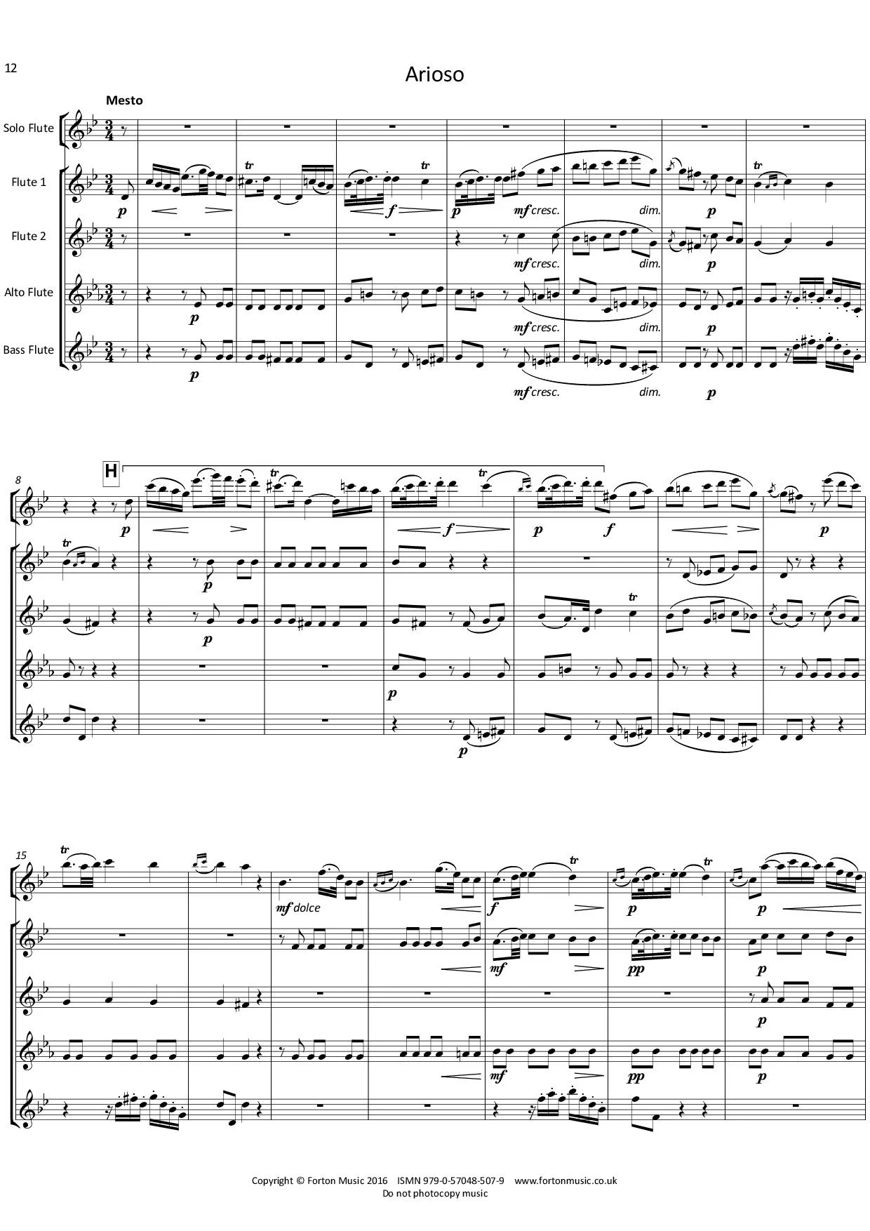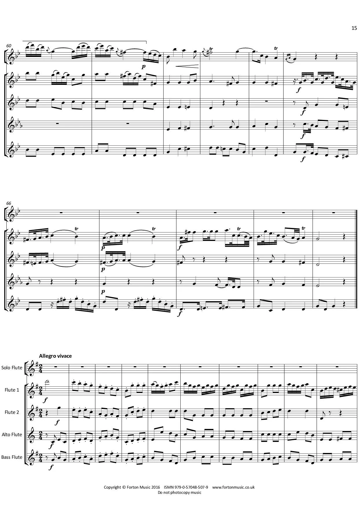 This concerto by Quantz follows the standard movement pattern of the time – a lively first and last movement with a central slow movement. The first and last movements are in broad ritornello form. Entries of the original theme are interspersed with showy passages for the soloist. The central movement is titled ‘Arioso’, and is more through composed, featuring a singing melodic line that passes through a wide range of moods before coming to a peaceful close. The solo line has been left broadly unchanged in this arrangement, the accompanying flute parts are relatively straight forward but require conviction and neat articulation.
