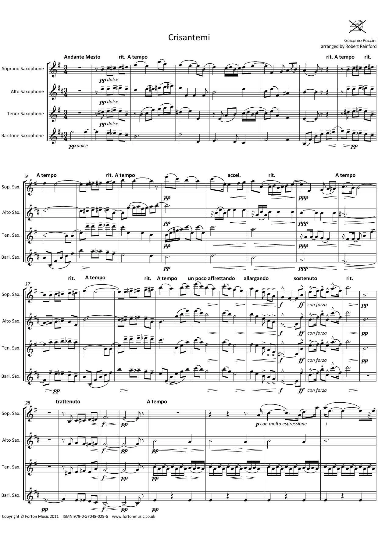 Written in 1890, this short work features all Puccini’s characteristic operatic traits in an instrumental work. Richly, chromatic harmony, extremely flexible tempi, and highly charged emotions all feature here. Soprano sax leads, but the middle section features soprano and baritone sax in octaves, with alto and tenor completing the harmony. All parts are complex, and use just about the full range of the instrument, so suitable for players of about grade 6 standard and upwards.