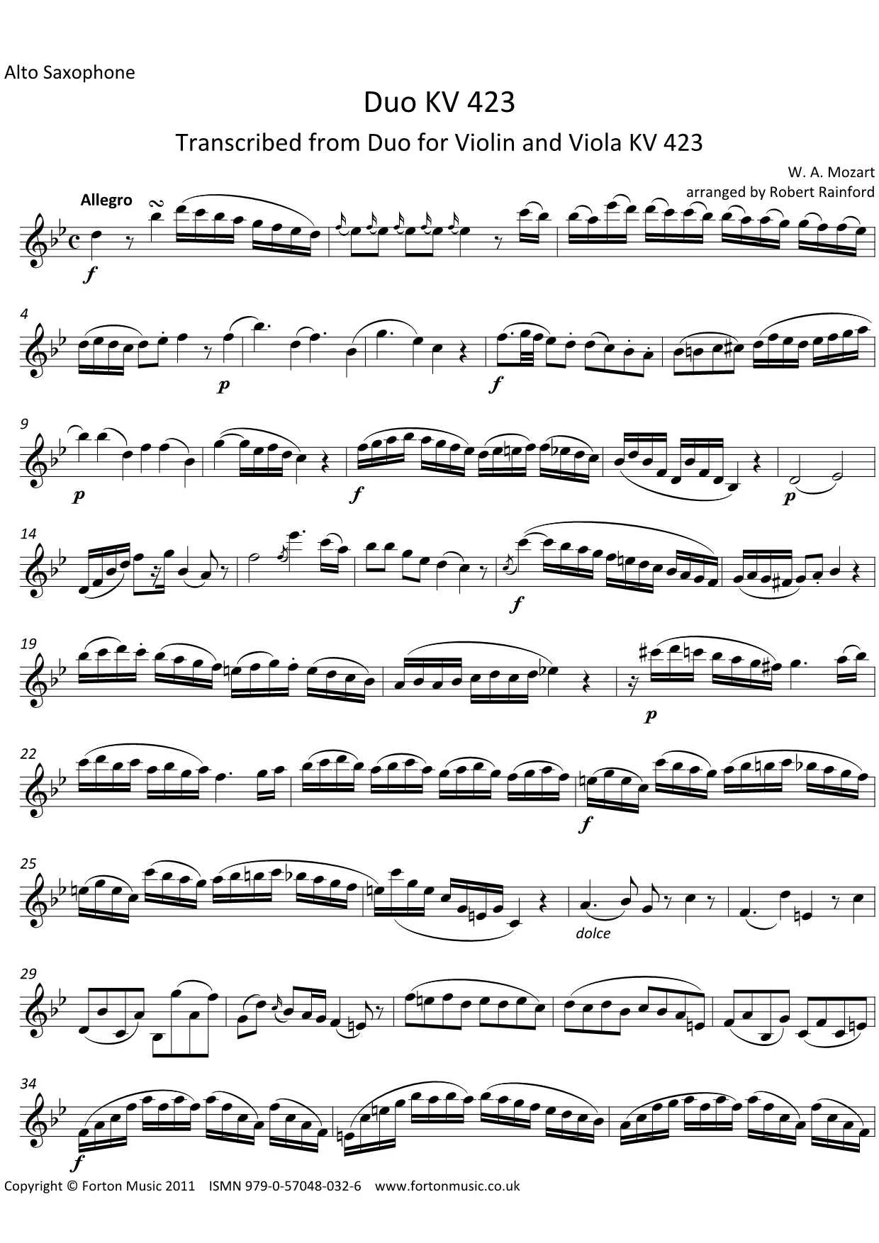 Originally for violin and viola, the different timbres of the original instruments are matched well by the two differing saxes in this arrangement. In three movements, the first of which features fast running semiquavers in both parts. The central slow movement is very florid and highly ornamented, requiring neat finger work. The last movement is fast again, building to an exciting climax. Using the full ranges of both instruments, suitable for advanced players of grade 7-8 standard.