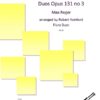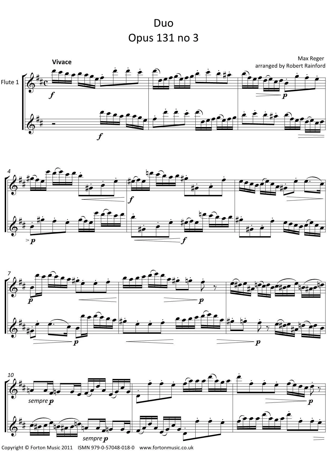 Two duets by Reger, arranged for two flutes. The first movement is a compete canon, with the second player entering after half a bar. The second duet has a similar feel but is more fugal, with the second part being more independant of the first. This contrapuntal texture gives the music a Baroque feel, but the wide ranging keys, multiple time changes and dramatic dynamics add a more Romantic dimension to the pieces. Fairly short pieces (about 40 bars and about 50 bars) but marked at Vivace and Allegro con spirito, these are around grade 7-8 standard.