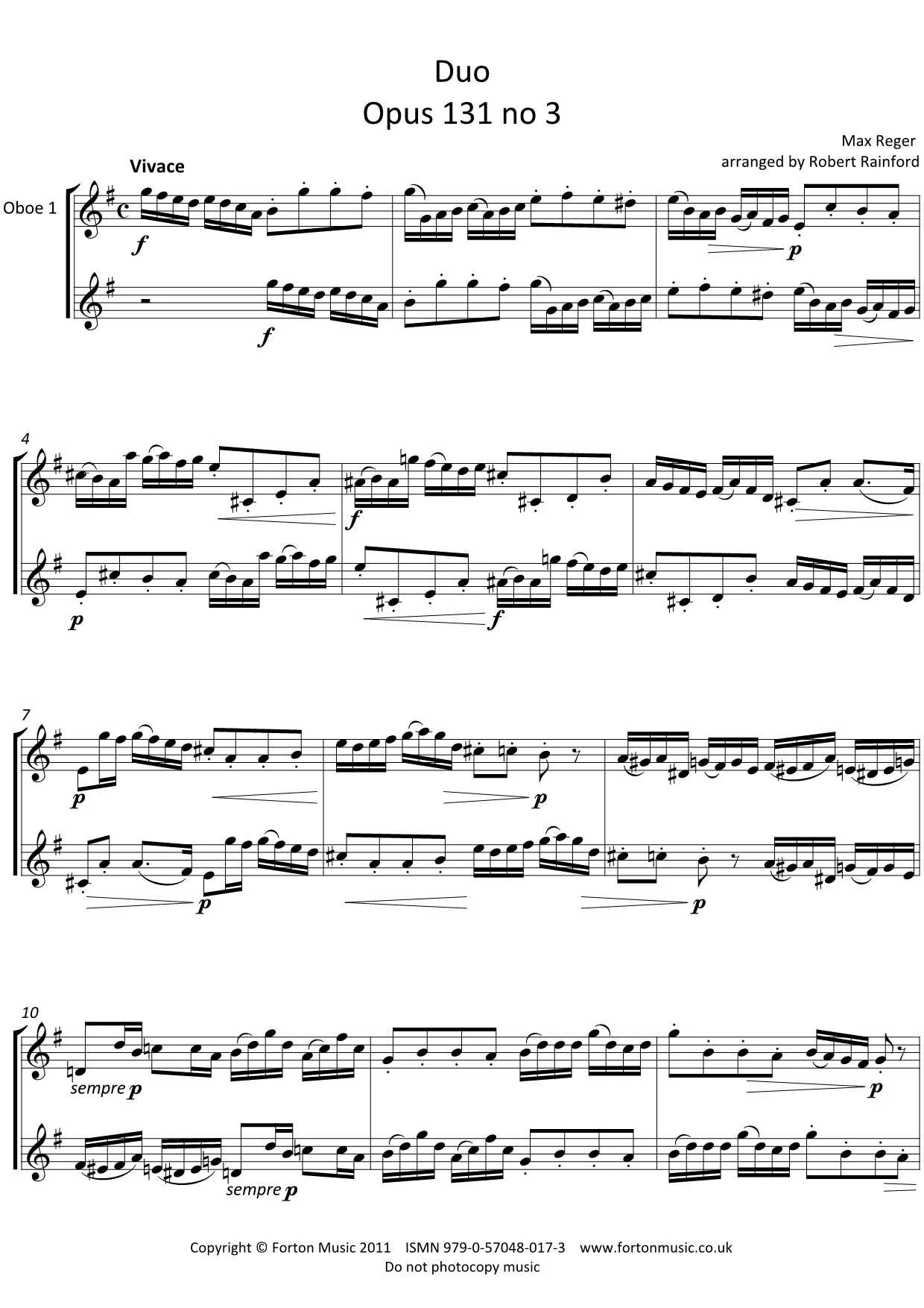 Two duets by Reger, arranged for two oboes. The first movement is a compete canon, with the second player entering after half a bar. The second duet has a similar feel but is more fugal, with the second part being more independant of the first. This contrapuntal texture gives the music a Baroque feel, but the wide ranging keys, multiple time changes and dramatic dynamics add a more Romantic dimension to the pieces. Fairly short pieces (about 40 bars and about 50 bars) but marked at Vivace and Allegro con spirito, these are around grade7-8 standard.