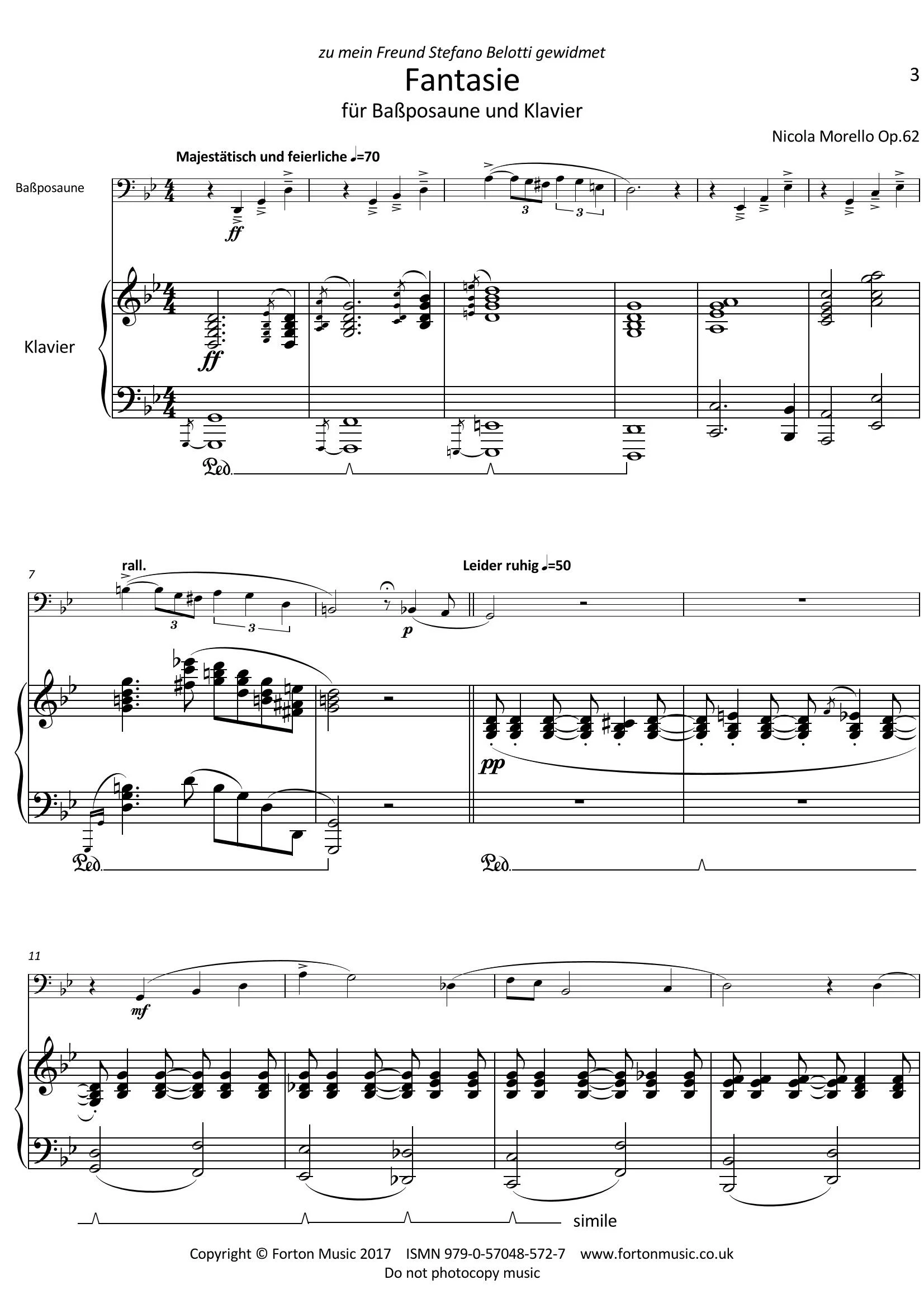Bass Trombone hasn’t a significant solistic repertoire, often confined to orchestral roles. So I decided, on the request of Mascoulisse Quartet’s member, Stefano Belotti, to compose a concert piece for this instrument. The “Fantasia” for Bass Trombone and Piano is a combination of Lied-form and Sonata-Form. A sophisticated and intriguing musical path, in which a trombonist could exploit all of the instrument’s nuances, playing in a comfortable, but wide, range full of articulations. An elegiac theme unfolds his notes through a continuous development of neoromantic memory, with heroic moments, gentle harmonies and lyrical melodies, revealing the potential, so underdeveloped, of this magnificent instrument.