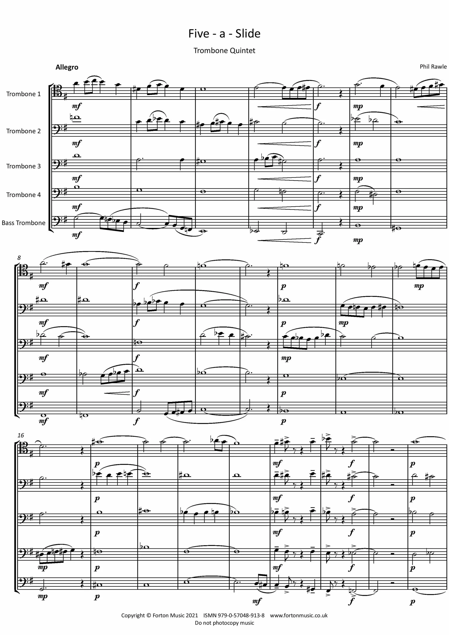 This is a short, novelty piece for five trombones. Rhythmically straightforward, but with some close harmonies reminiscent of a big band. Fun and rewarding for all players!