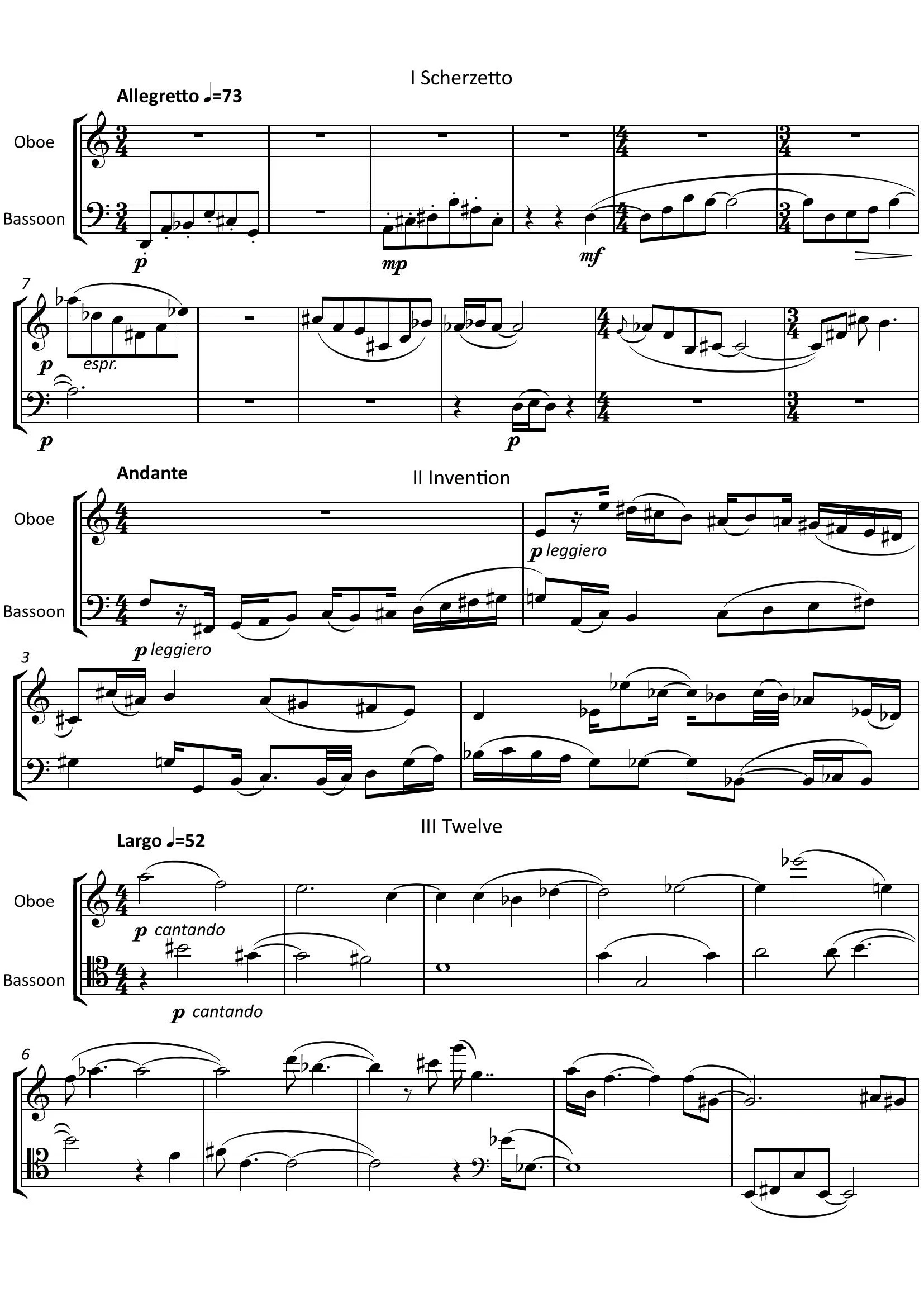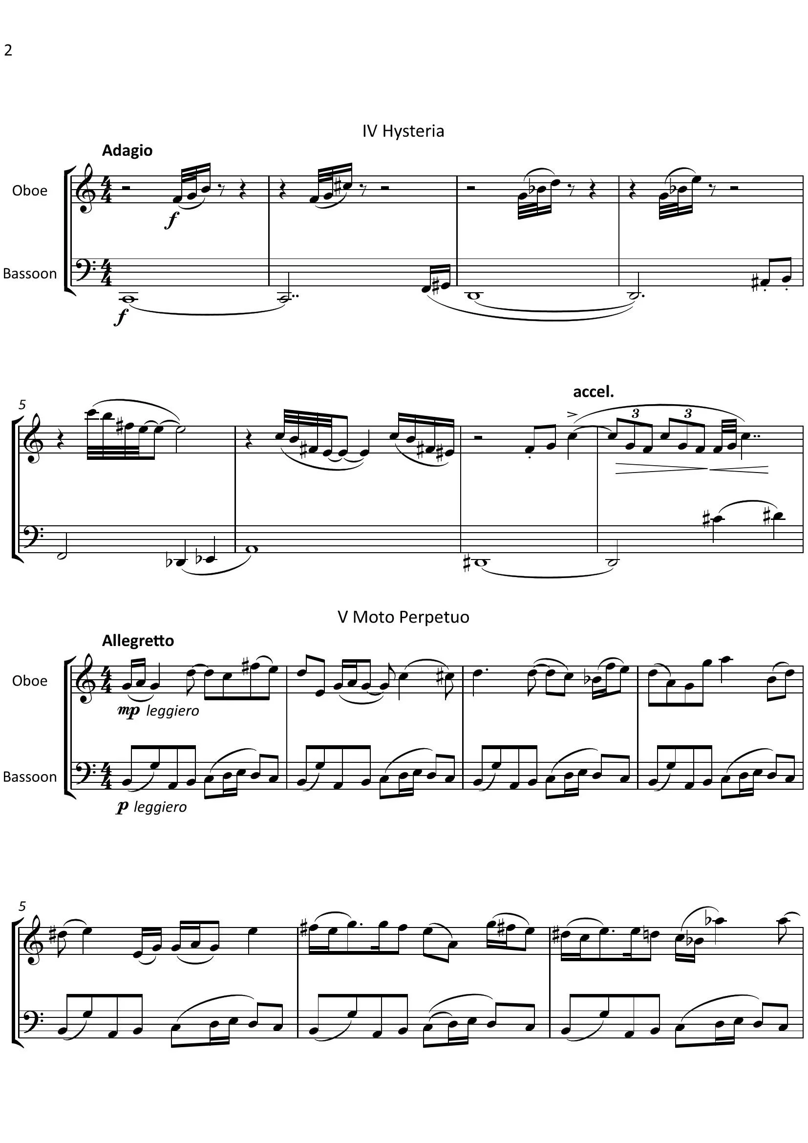The words atonality and humour are perhaps not often associated with each other, but these pieces are intended to do that. The individual titles indicate the character of each piece, which is largely contrapuntal and imitative in style, so neither instrument dominates. All movements end consonantly except for the last, which can be extended ad lib. In live performance, for instance, it might fade away as the players exit the playing area. The bassoon is spared relentless repetition of the ground motif by its being shared with the oboe.
