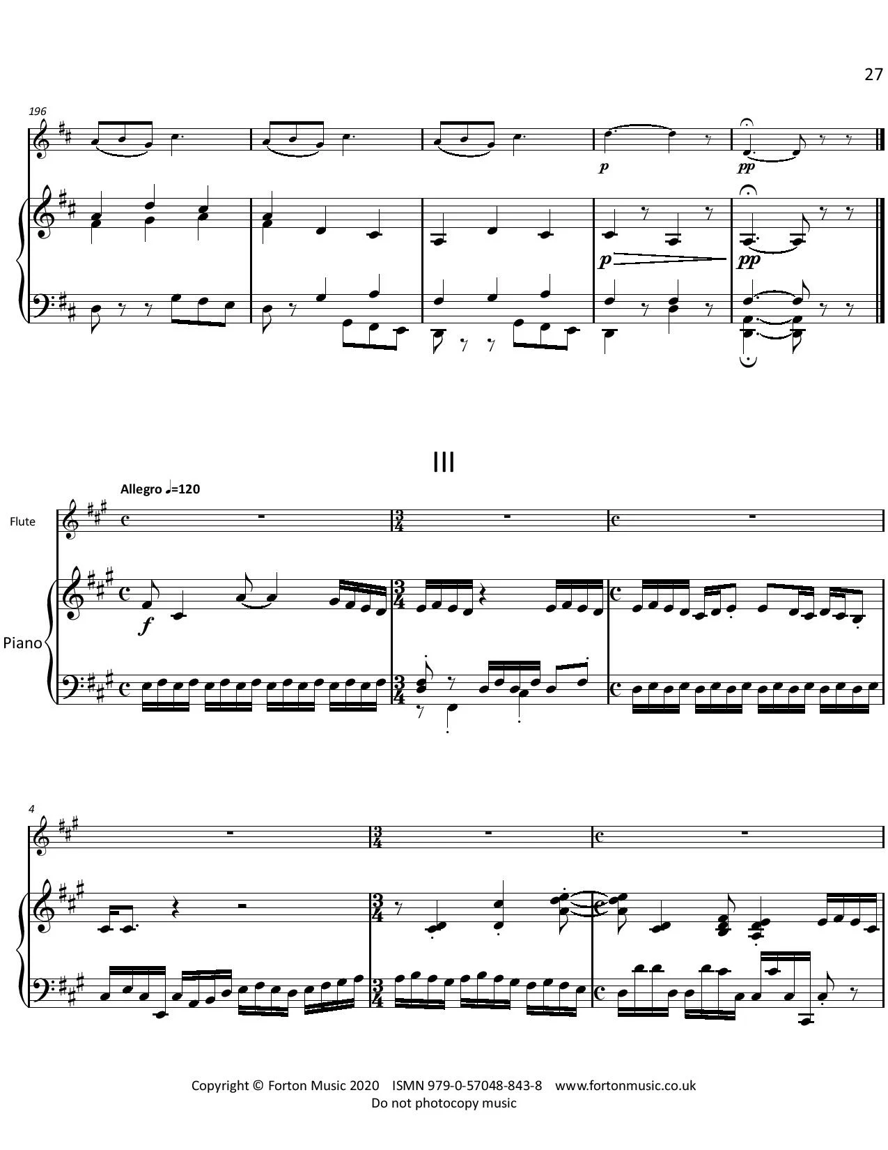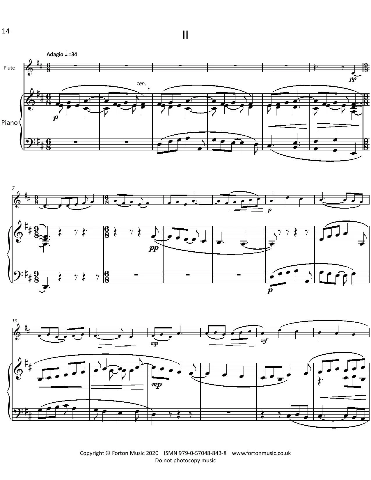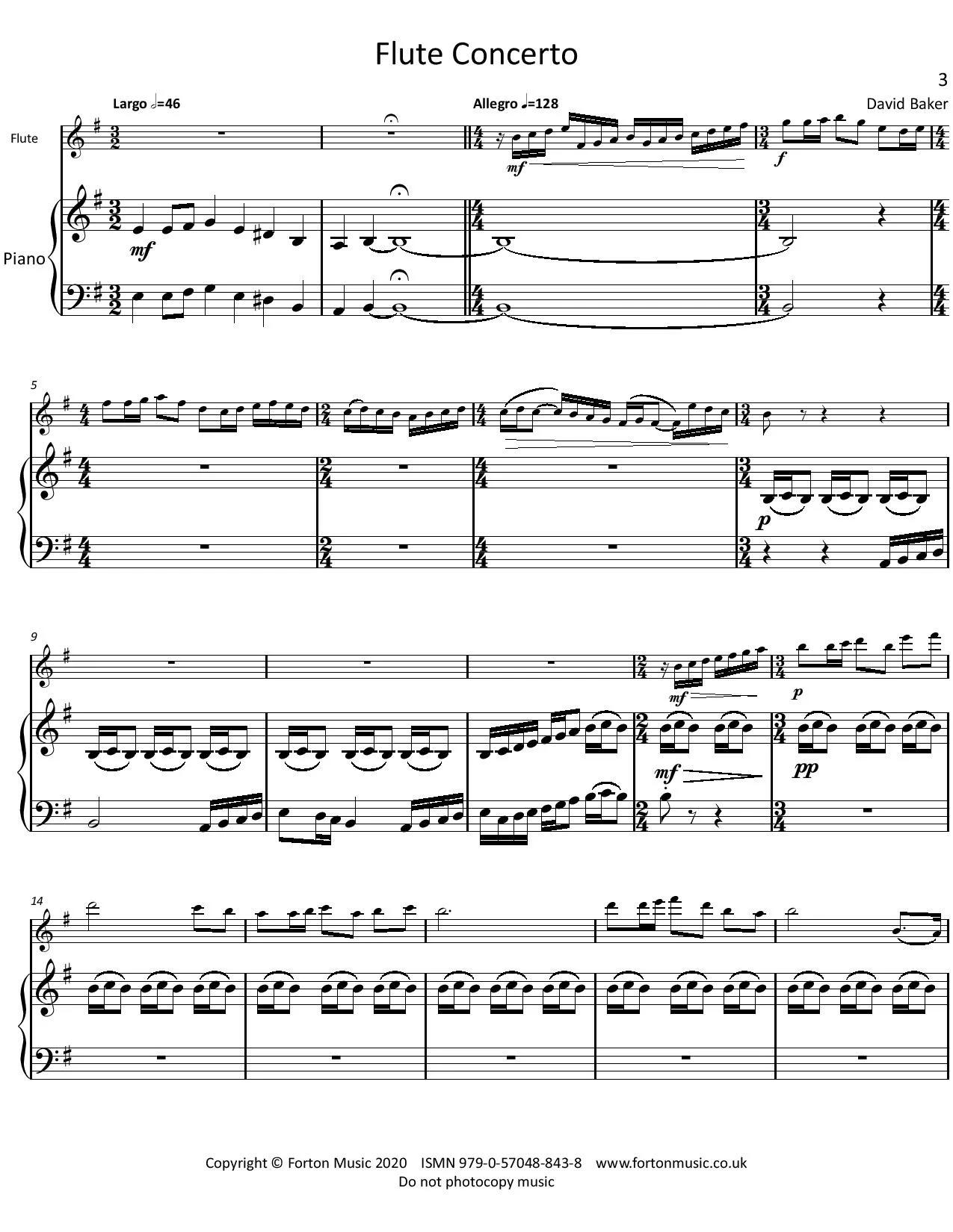 From an embryonic germ of an idea that is the opening of the second movement of this work grew what originally was a ‘stand alone’ sonatina (titled; On Reflection). On revisiting this sometime later, intrigued by a wealth of almost incidental and undeveloped material within, I saw an opportunity to expand the piece to the three movements presented here. This expansion, built around a central pier, creates an unexpectedly strong feeling of déjà vu at various moments throughout the composition…. snippets of familiar sounding melody or ‘known’ harmony giving a unity to work as a whole. This version for flute and piano is not simply a ‘piano reduction’. On the contrary; it was originally conceived as a sonata with equal voices, and then, as a commission, re worked and orchestrated to form a concerto. This slightly unusual evolution has resulted in a concerto that gives both soloist and accompanist the opportunity not only to shine , but to demonstrate that wonderful interaction inherent in chamber music performance.