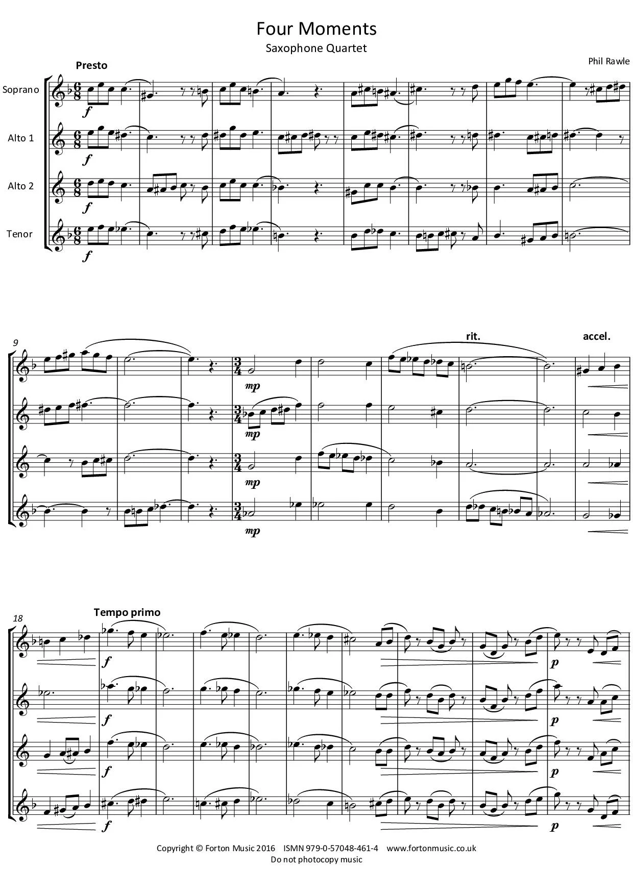 This quartet was written to cater for developing quartets and players, who may not have access to a baritone saxophone. It features four themed sections, each one capturing a different mood and style. A fast 6/8, a lyrical 3/4, a melancholy 4/4 with a more imposing final section and a reprise of the 6/8 section to finish with. With more than a touch of jazz to the harmonies, a great short piece for lower grade players.