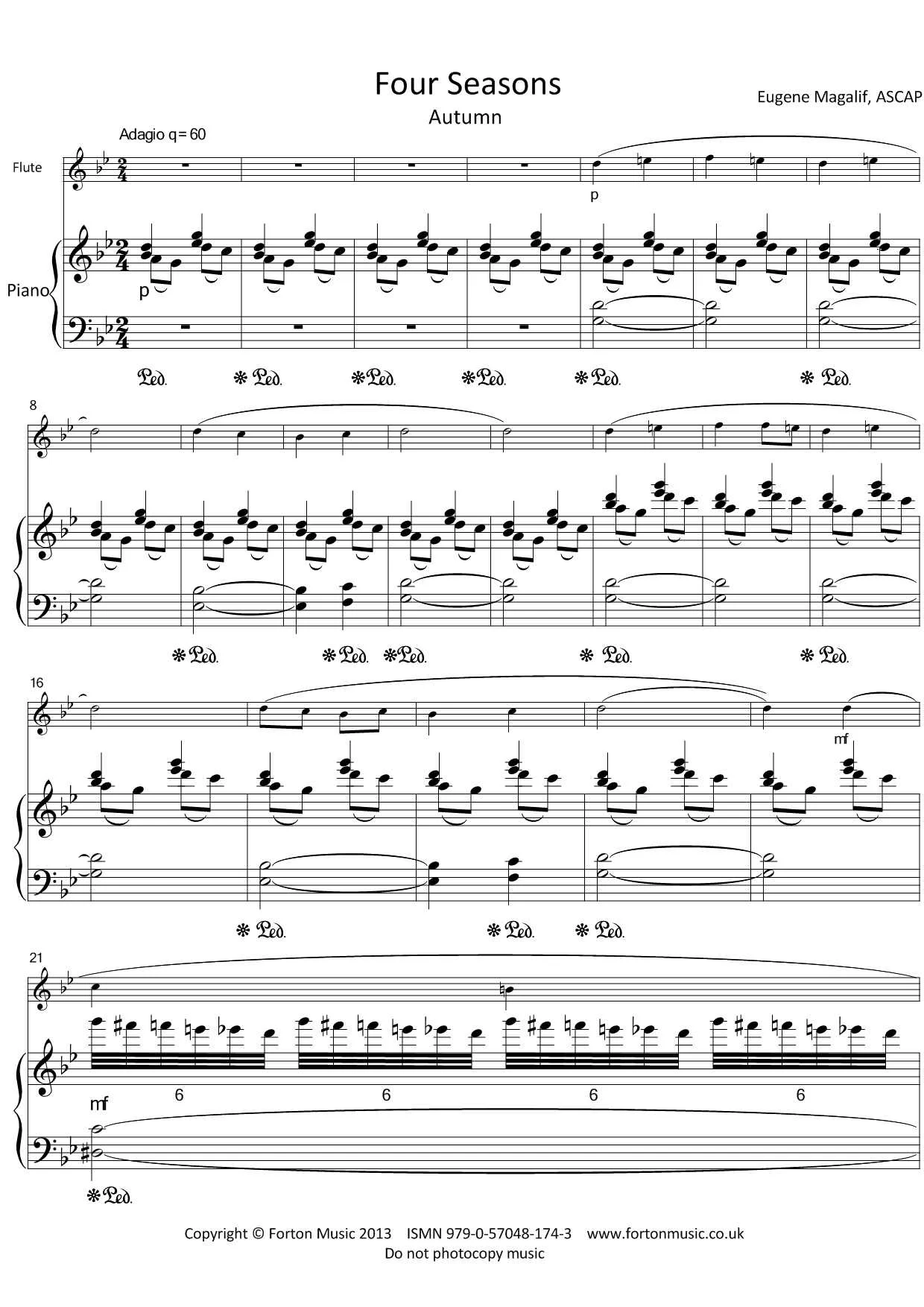 This is a mini suite for Flute and Piano with rainy and sad Autumn; frosty and calm Winter; melting snow, streams, awakening of nature in Spring; funny and jazzy Summer. Autumn was a mandatory piece at Moscow 2012 International Children’s Competition “My Favorite Flute”.