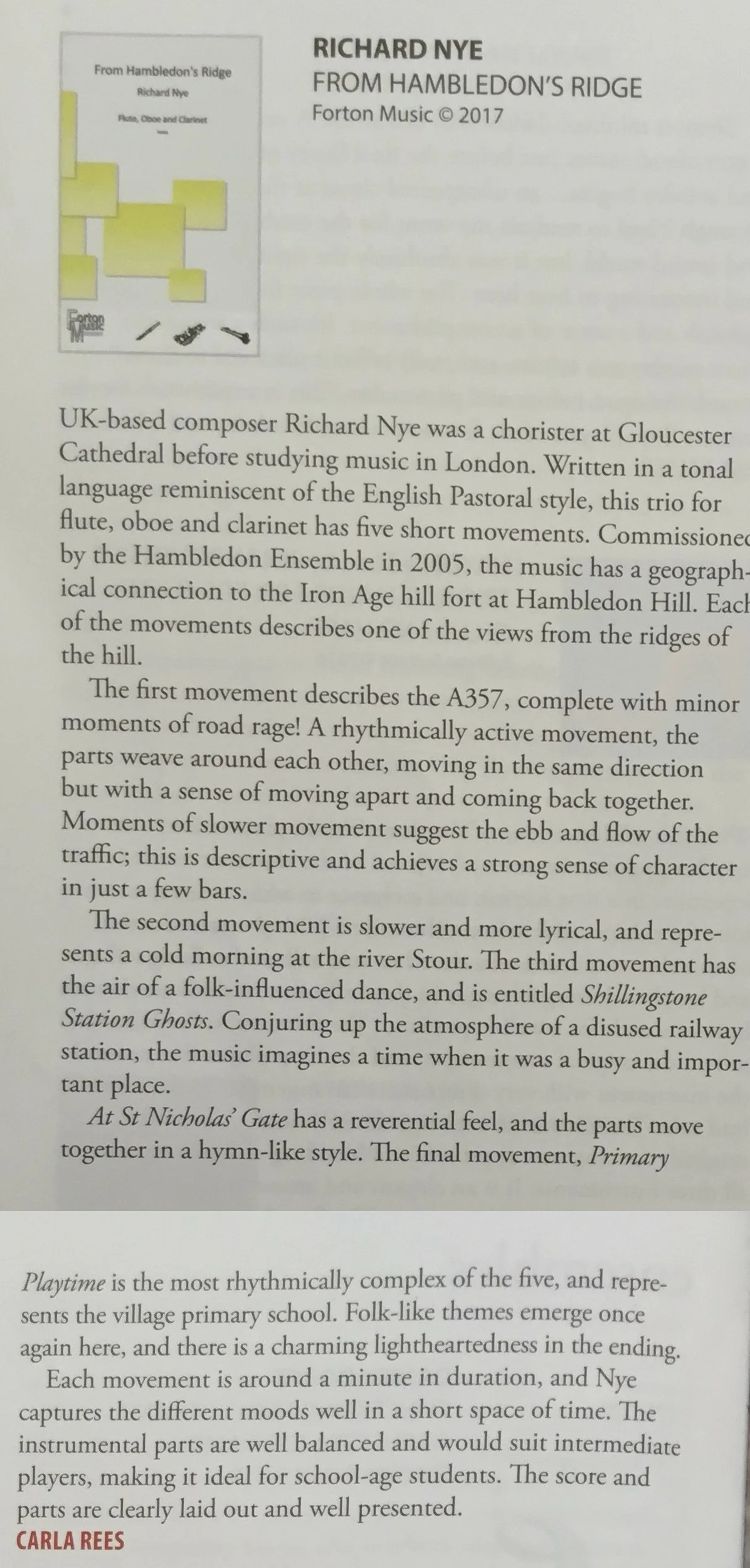 The commission brief asked for ‘several short sound pictures that described the area around the village of Child Okeford, Dorset’. Written for the Hambledon Ensemble in 2005, the work centres around Hambledon Hill and its ancient Iron Age hill fort. From the ridges you can see each of the five places explored in the work.