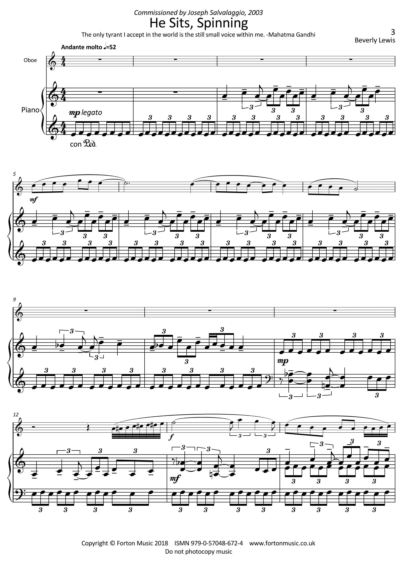 My inspiration for composing this piece came from the following quote by Mahatma Gandhi: “The only tyrant I accept in the world is the still small voice within me.” Mahatma Gandhi’s spinning related closely to his non-violent advocacy on behalf of the poor. It was important to him that his actions and lifestyle accurately reflect his strong convictionsconcerning justice and equality. His work at the spinning wheel is explained in the following two quotes from an article entitled, The Mother in the ‘Father of the Nation’ by Vinay Lal: “The constant rotation of the spinning wheel, though it might have suggested stagnation to some, was to Gandhi a profound illustration of the sustaining power of women,….” -and- “By taking upon himself the task of spinning, Gandhi sought to draw attention not only to the plight of Indian households, which had been stripped of their earning capacity by the heartless introduction of mechanization but to the exemplary role of women in keeping the household afloat through their daily efforts at spinning.” It seems that the act of spinning on a spinning wheel can be done for many different reasons. For my great-great grandmother in rural eastern Canada, it had to have been unavoidable physical labour. For Gandhi, it was something he did by choice and his act of spinning eventually came to take on political meaning. Spinning is always creative; productive; mesmerising in its constant, repetitious motion; comforting in its regular, rhythmic movement and, conversely, disturbing in its irregularity, its ebbs and flows, its sudden increase or decrease of speed. This short piece of music is meant to evoke an image of Gandhi as he works at his spinning wheel and thinks about the state of the world. This spinning can be heard, in varying motives, tempi and instrumentation. Shortly after it begins, the most obvious spinning motive is passed back and forth between the oboe and the piano and then, finally, the two instruments play it together in close imitation. Later, the spinning is interrupted by a free, chant-like part which represents Gandhi’s voice as he yearns for world peace. In order to create tension and a sense of unpredictability in my music, I like to employ what is known as the “cross-relation” or “false-relation”. This used to be considered a compositional crime and is committed by combining a note and its chromatically altered note (i.e. sharpened or flattened) in different “voices” within the same chord or within two adjacent chords. It creates an excruciating dissonance or “crunch”, as we often call it and sounds remarkably like wrong notes to the casual listener. I have therefore sprinkled them lightly throughout the piece. After the chant-like part, the spinning returns and we quickly move on to the most dramatic part of the piece, a solo oboe cadenza in which the spinning is at its most intense. This passage of music is very rhythmic and, especially at this fast tempo, presents the oboist with the challenge of having to bring out the accented notes while keeping all others relatively inconspicuous. Once the cadenza finishes, we return to more contemplative spinning until the end, when the wheel gradually slows to a stop. He Sits, Spinning had its world première by Joseph Salvalaggio (oboe) and myself (piano) at a concert of the Memphis Chamber Music Society, Memphis, Tennessee, USA on January 18, 2004. -Beverly Lewis