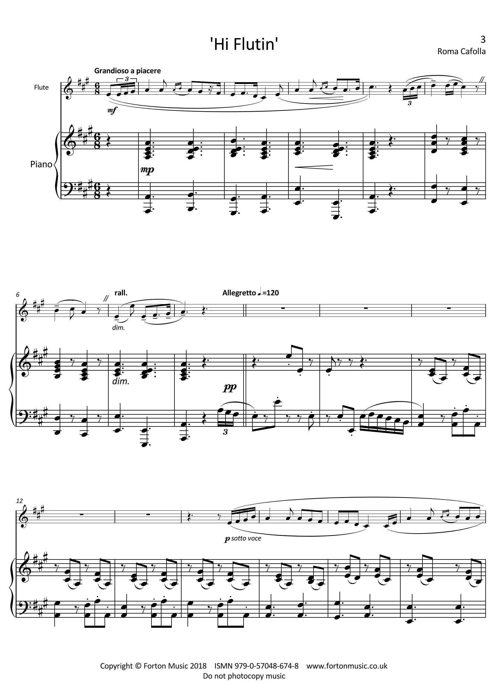 There was a saying when I was growing up in my home town – She’s very ‘Hi Flutin’ – and this took shape in my mind as a fun piece for flute and piano requiring good technique and an ability to sound spontaneous with its changes in tempo and mood. A simple melody which has variations ranging in difficulty and interspersed with slower contrasting passages ably supported by a rhythmic and equally balanced piano accompaniment. It was enjoyable to write and I hope you have fun playing it.