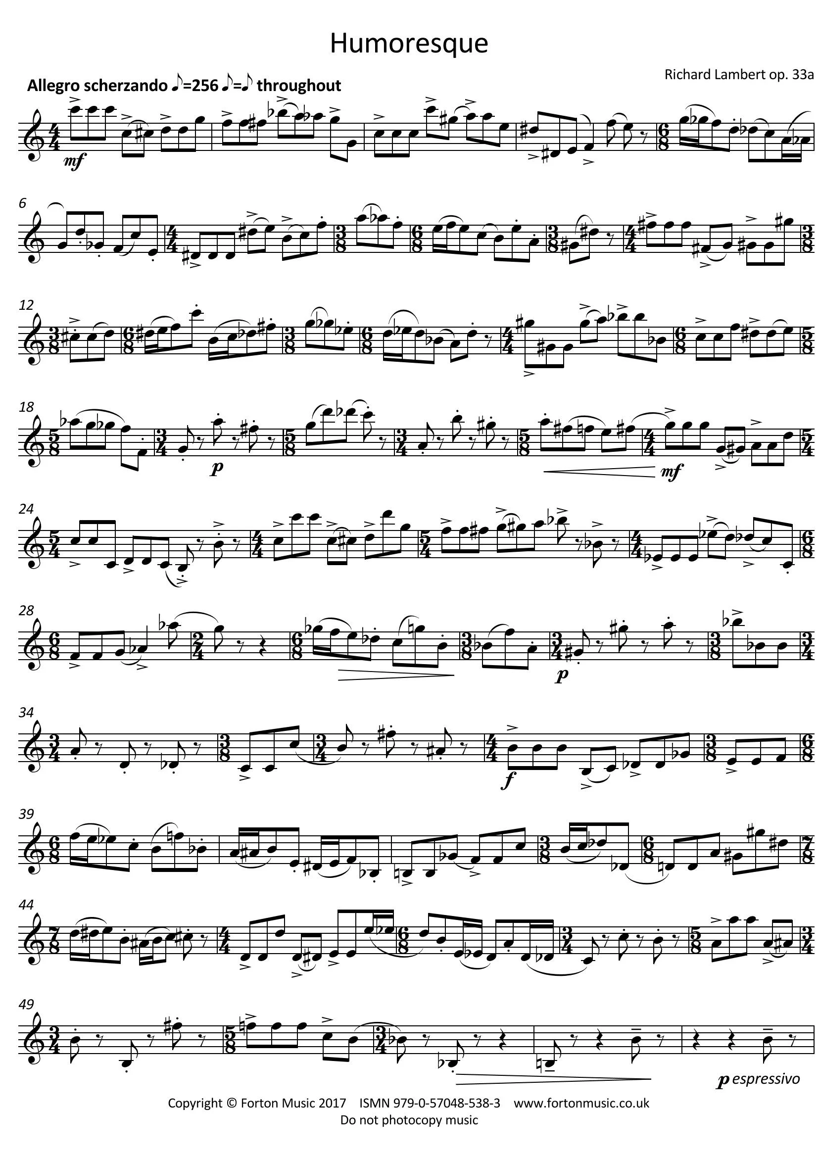 Composed in January 2009, this short tour de force was originally written for bassoon, with this arrangement for saxophone being made in 2017. Structured in a simple ternary form, the outer sections are highly chromatic (loosely centred around the note B flat, but eschewing a sense of key) and there are many changes of time signature, giving it highly rhythmic energy. The brief central section is more reflective and is a free development of a motif heard in bars 30 to 35: an eighteen-note ‘theme’ is subjected serially to four variations in a quasi-waltz style, employing this time a consistent 3/4 time signature. The sections are joined with a hesitant quaver figure, which is first heard in bar 19.