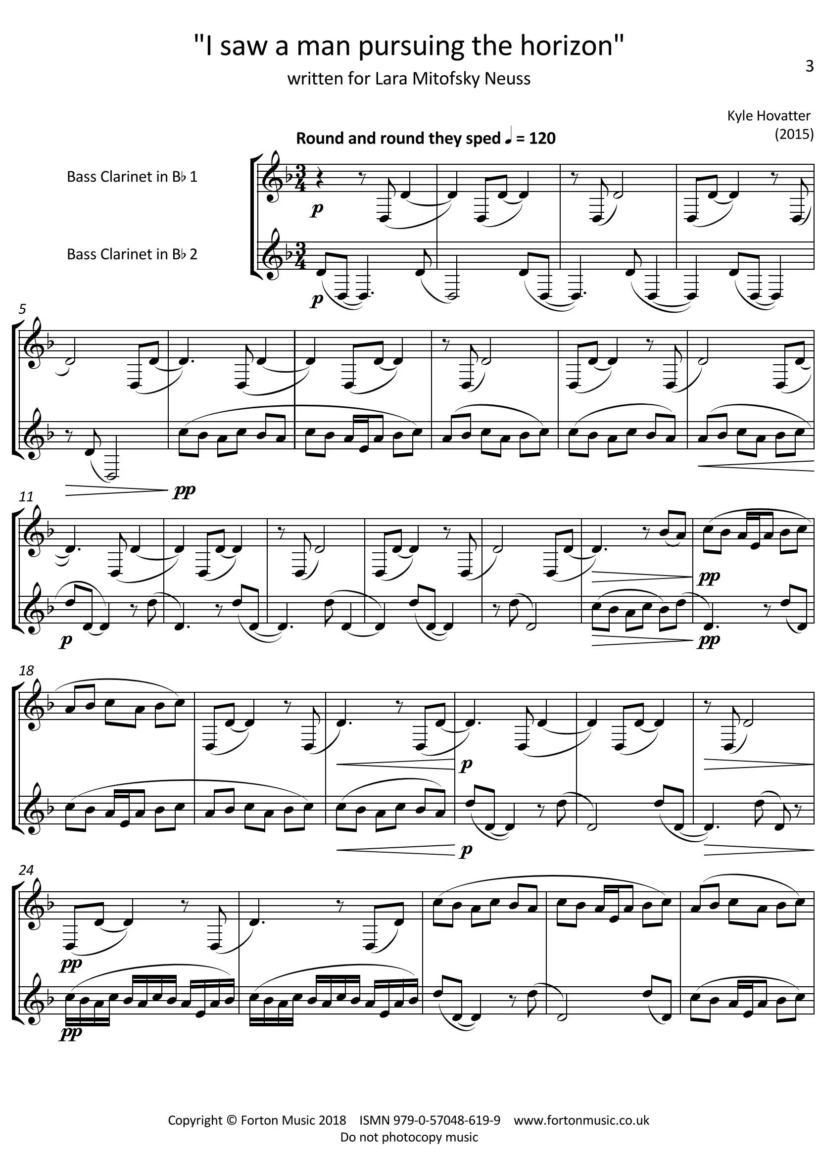 Hovatter utilizes the unique power of the bass clarinet to put the listener into an alternate world. The combination of the two bass clarinets weaving similar material together forms a relaxing yet somewhat creepy texture. Each player has ample opportunity to express themselves freely and openly. Combining this with the intense power of the dense middle section brings us on an emotional journey through harmony.