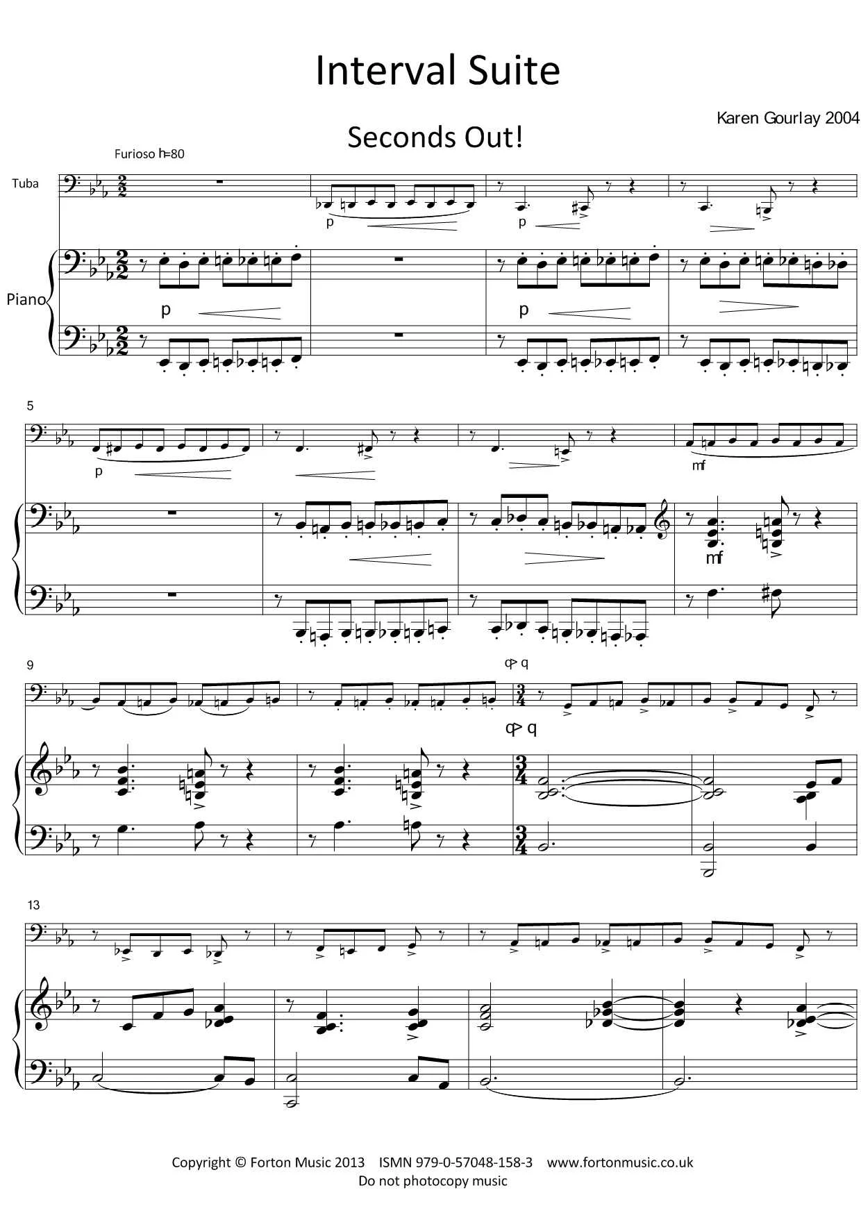 A suite of pieces for solo tuba and piano, each movement based on a different interval. Imaginative titles (Seconds Out!, Two Thirds, Forth Bridge, Flat 5, Six Of One…, Seventh Day and Pieces Of Eight) add to the charm and appeal of this piece, and each movement is superbly crafted with an individual character and feeling exploring a different aspect of the tuba’s personality. Aimed at players of about grade 5 standard and upwards.