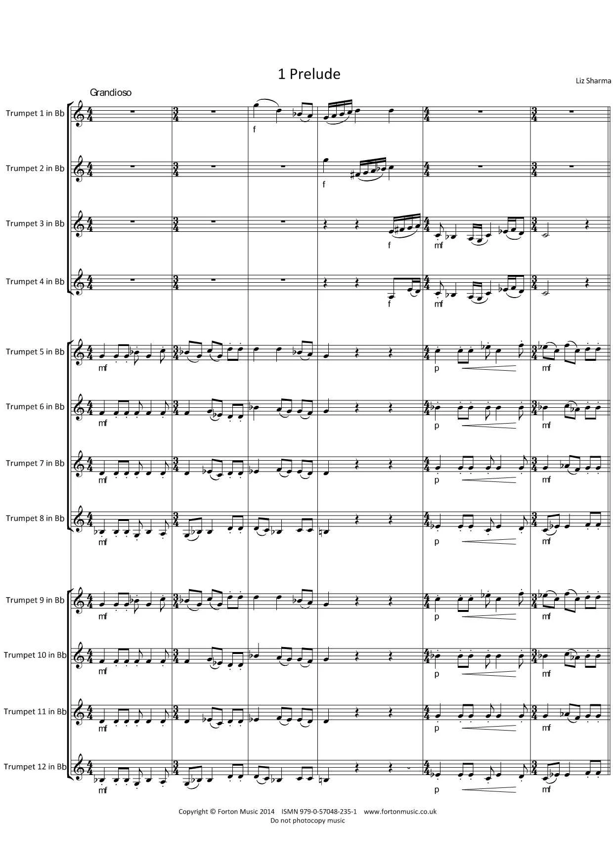 An interesting set of pieces for 12 trumpets (but can be played by 8). Each of the three movements features open sections with chord symbols allowing as many players as desired to have a go at improvising. An exciting way of introducing this concept in a new situation.