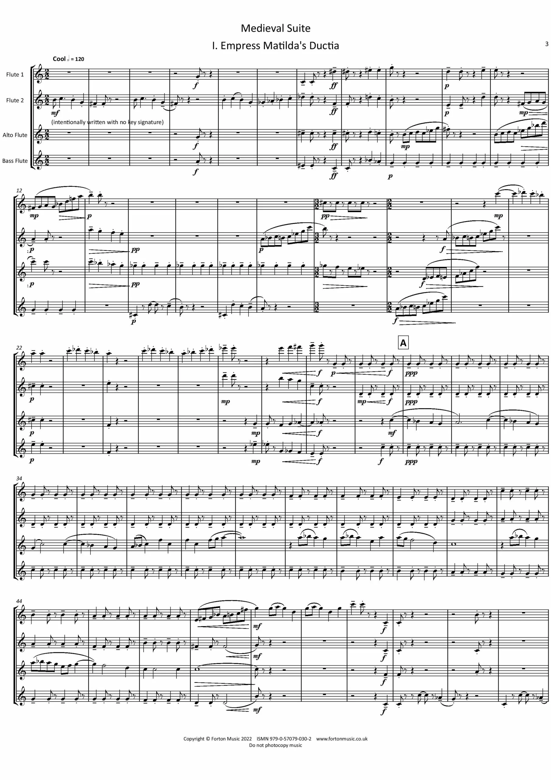 I was honoured to be asked by the wonderful Asyla oboe quartet to write a piece for them to be performed in an upcoming series of concerts. It felt very much like writing for a consort rather than the modern concept of a chamber ensemble…. and so was born the idea of a Medieval Suite. This then gave rise to this version of the same piece for flute quartet. The four different flutes each with a distinctive character, yet forming a homogenous sound together gives amazing scope to write consort music without the constraints of range and virtuosity imposed by early instruments.