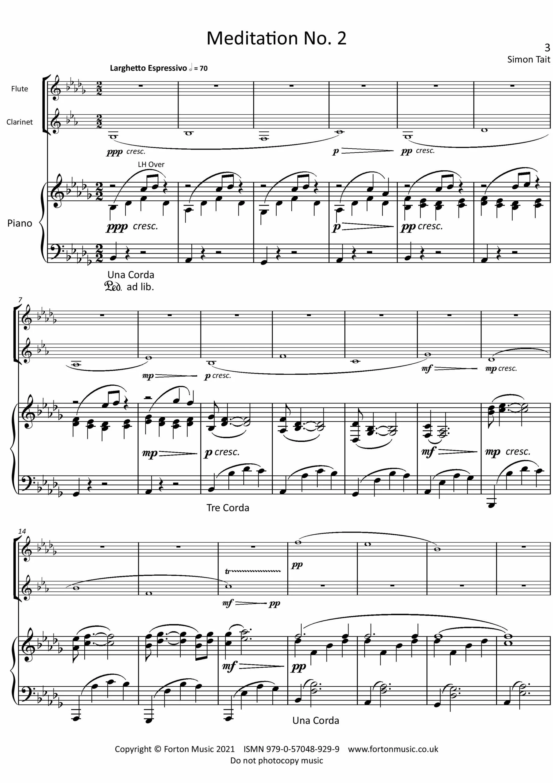 Meditation for flute and clarinet is one of a series of lyrical, reflective pieces for piano and other instruments. It was composed for and first performed by the composer, Janet Oates (flute) and John Holland (clarinet) at the London Composers’ Forum Aspects of Piano concert. The aim was to provide a satisfying piece which the performers would enjoy playing together.