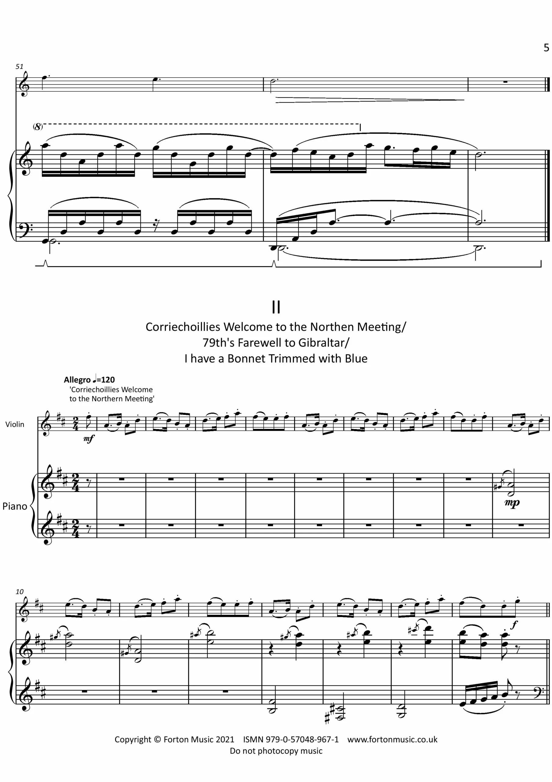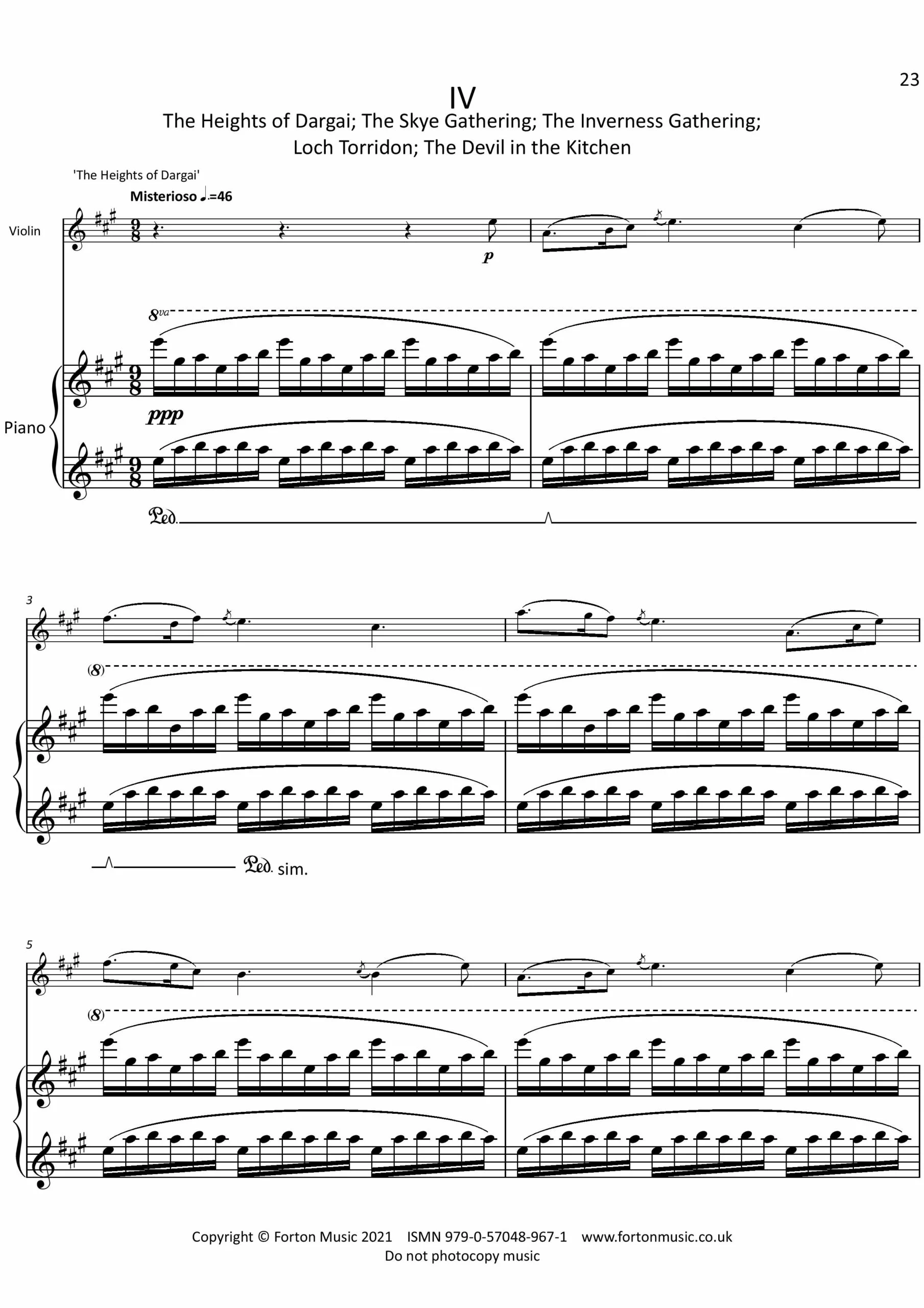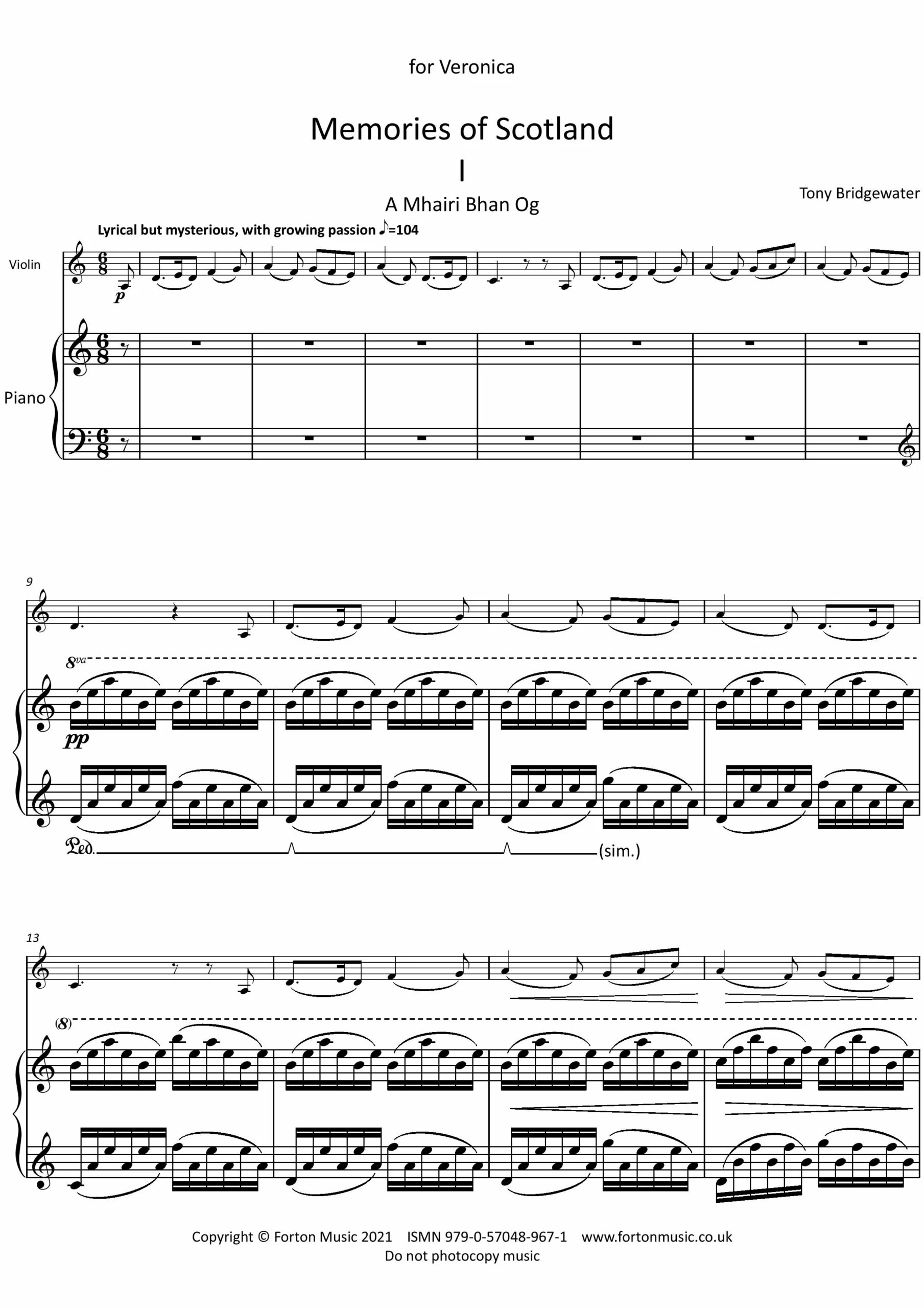 I wrote Memories of Scotland in 2018 after a beautiful and sometimes spectacular driving holiday in Scotland with my wife, the dedicatee. It is based on a number of traditional Scottish Dances for solo violin, which are arranged into four paired movements. Each pair begins with a slow introduction, evoking the scenery of the Highlands. In the first movement, ‘A Mhairi Bhan Og (Fair Young Mary)’ I imagined a young woman singing to herself by the shores of a loch, while in the third ‘Huntingstone Castle’ I thought of a long abandoned and crumbling fortress, with centuries of history contained within its walls. The second movement begins with a breezy solo violin melody and continues with a series of lively, contrasting dance tunes. There is a slower, more whimsical central section based on ‘I Have a Bonnet Trimmed with Blue’ before the music builds again to a furious conclusion. The final movement begins very calmly with a depiction of ‘The Heights of Dargai’, before we hear in the distance ‘The Inverness Gathering’, as if we are looking down on a growing crowd of revellers. The following dances include the rather inebriated ‘Loch Torridon’ and the wild ‘Devil in the Kitchen’, and the music builds to its end with the return of ’79th’s Farewell to Gibraltar’ from the second movement. ‘Memories of Scotland’ was first performed in Cambridge by Anna Downes (Violin) and the composer, and it has pleased audiences on many occasions since as a regular part of our repertoire.