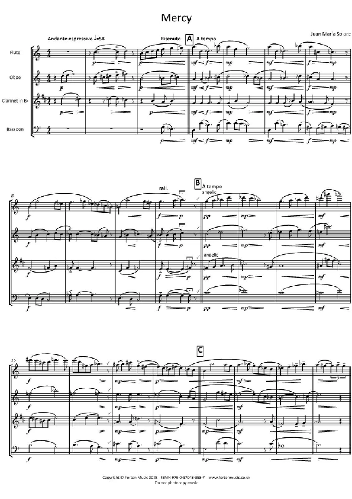 For Flexible Wind Ensemble. Flute1/Clarinet 1, Oboe 2/Clarinet 2, Instrument in F/Clarinet 3, Bassoon or Bass Clarinet 4. ‘Mercy’ is an obsessively expressive Adagio (so to say, a Samuel Barber’s equivalent for woodwinds) with a homophonic texture, like a four part chorale. Rhythmically, this piece offers no problems. While the first part requires more experienced players, parts 2, 3 and 4 are relatively easy to play. Most groups would be able to master this piece after only a couple of rehearsals. Some would say that mercy is a virtue, others (following Nietzsche) that it is a weakness. Do not seek in this piece a one-to-one musical transcription of merciful feelings, but rather concentrate on the smoothness and tender sound quality associated with it. Rather than ‘pity’, mercy is about empathy, togetherness and support – this attitude can also show while performing music.