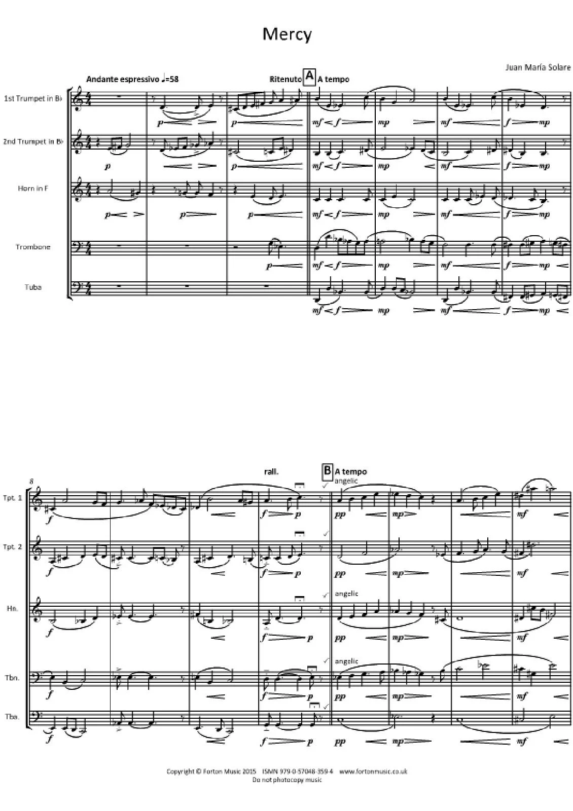For Brass Quintet, ‘Mercy’ is an obsessively expressive Adagio (so to say, a Samuel Barber’s equivalent for woodwinds) with a homophonic texture, like a four part chorale. Rhythmically, this piece offers no problems. While the first part requires more experienced players, parts 2, 3 and 4 are relatively easy to play. Most groups would be able to master this piece after only a couple of rehearsals. Some would say that mercy is a virtue, others (following Nietzsche) that it is a weakness. Do not seek in this piece a one-to-one musical transcription of merciful feelings, but rather concentrate on the smoothness and tender sound quality associated with it. Rather than ‘pity’, mercy is about empathy, togetherness and support – this attitude can also show while performing music.