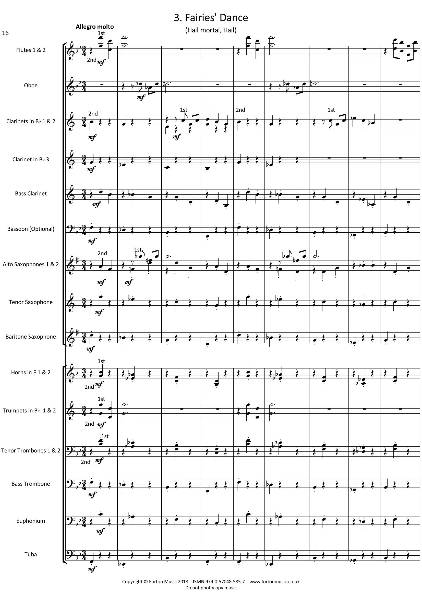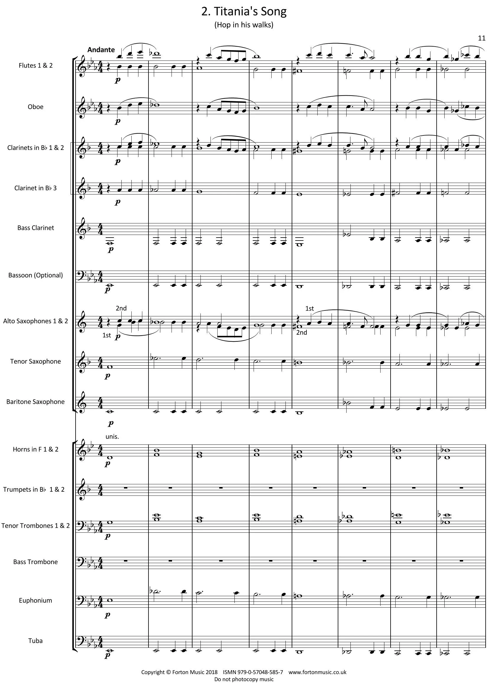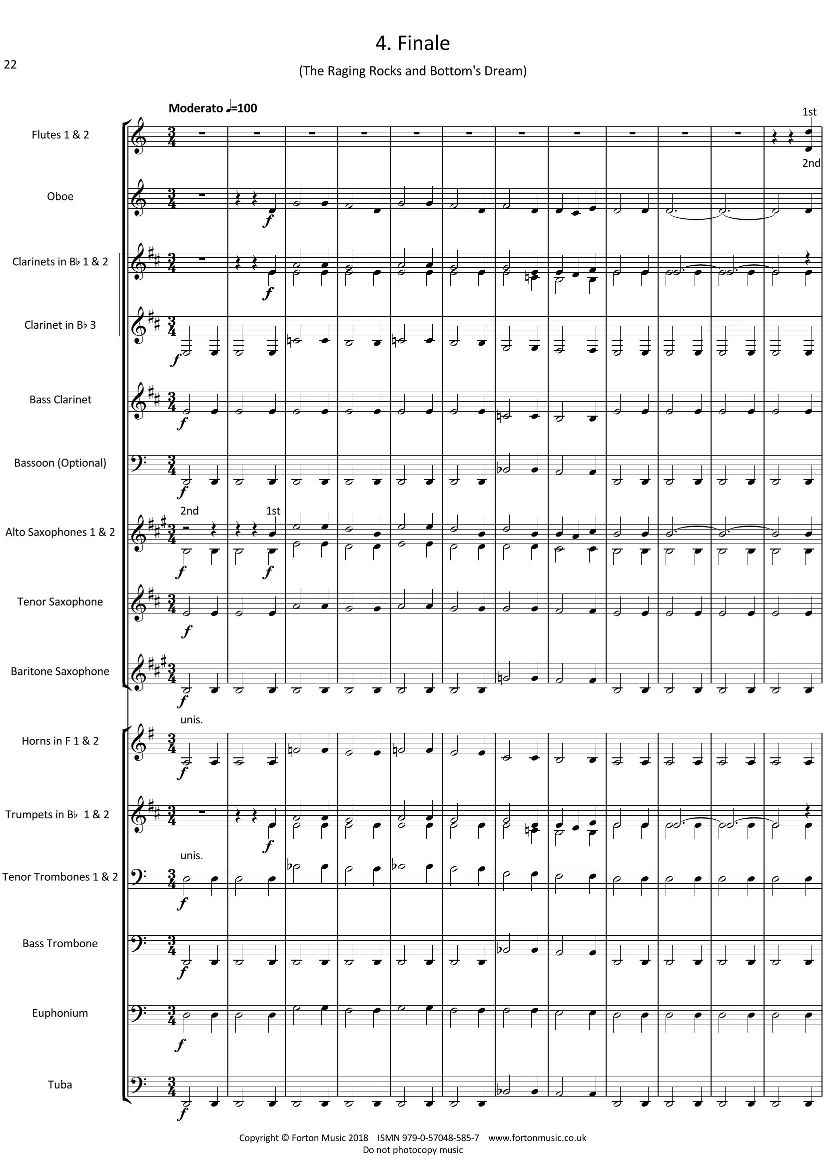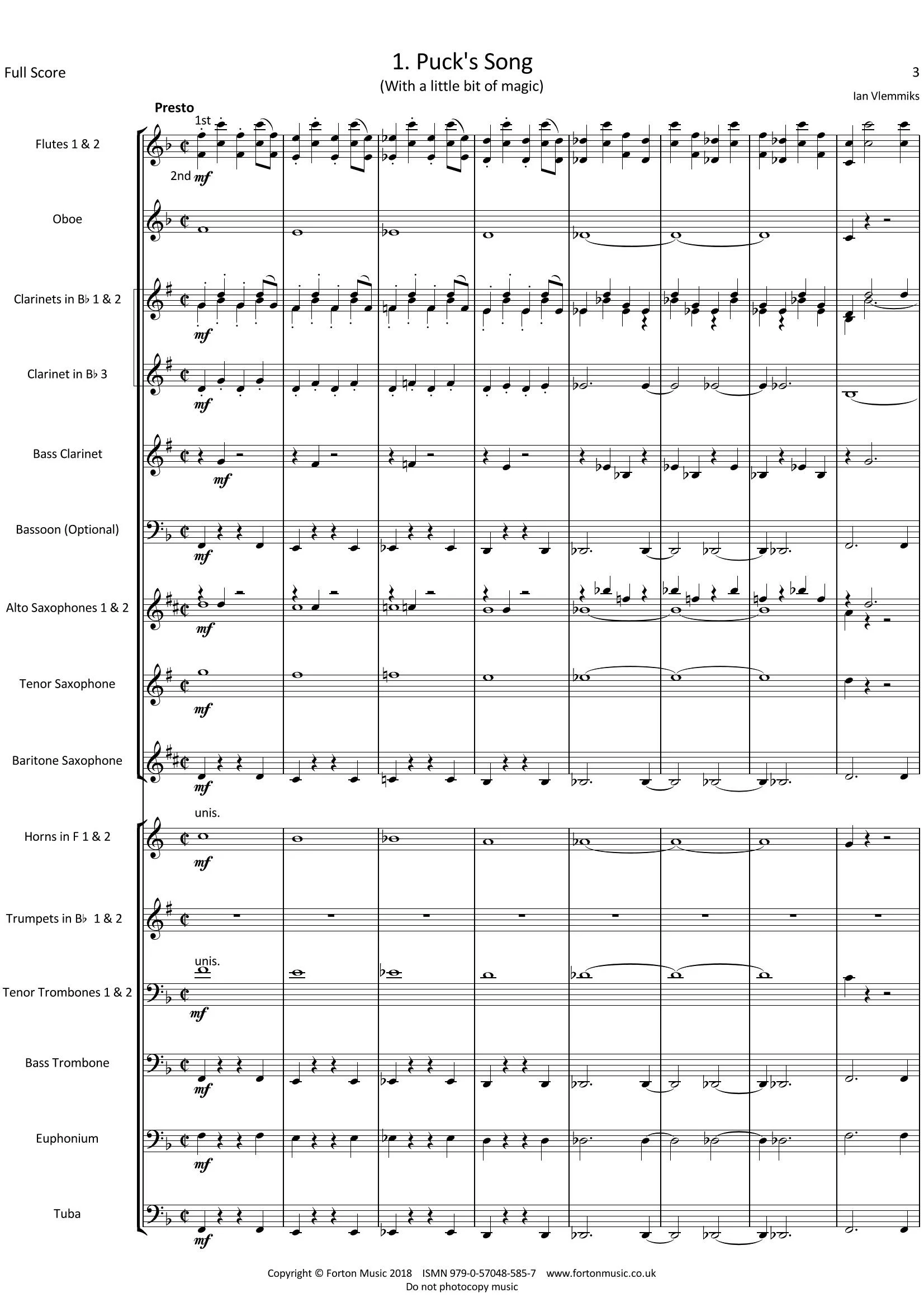 Midsummer Miniatures is based on a score I wrote many years ago which started life as a musicalĀ for the school I was working in at that time.Ā It was performed for a week and was producedĀ again years later at another school. A couple of years ago I decided to completely rearrange the music for wind ensemble. Originally it had been written for a mixture of instruments includingĀ piano, violin, trumpet, clarinet, flute etc.Ā I had to use what was available to me. It’s presented hereĀ in a much more standard wind band arrangement. As youāve no doubt realised it was based onĀ āA Midsummer Nightās Dreamā but from Bottomās viewpoint. Of the four movements I created from theĀ original score, two of them were songs sung by the characters. The third movement was actually a danceĀ and the last movement was made up of a short song and a passage of incidental music.Ā The musical was entitled āBottomās DreamāĀ This Suite is grouped like a micro-symphony, with a quick first movement, a slow second movement,Ā a lively dance like third movement, and then a finale with aĀ slow introduction leading in to aĀ fast movement to finish. Internally though, the movements are simpler, with tunes shared betweenĀ all melodic parts. Not technically difficult, a chance for bands to try some original new music.